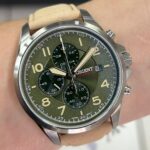 Características: com caixa em aço e pulseira em couro
