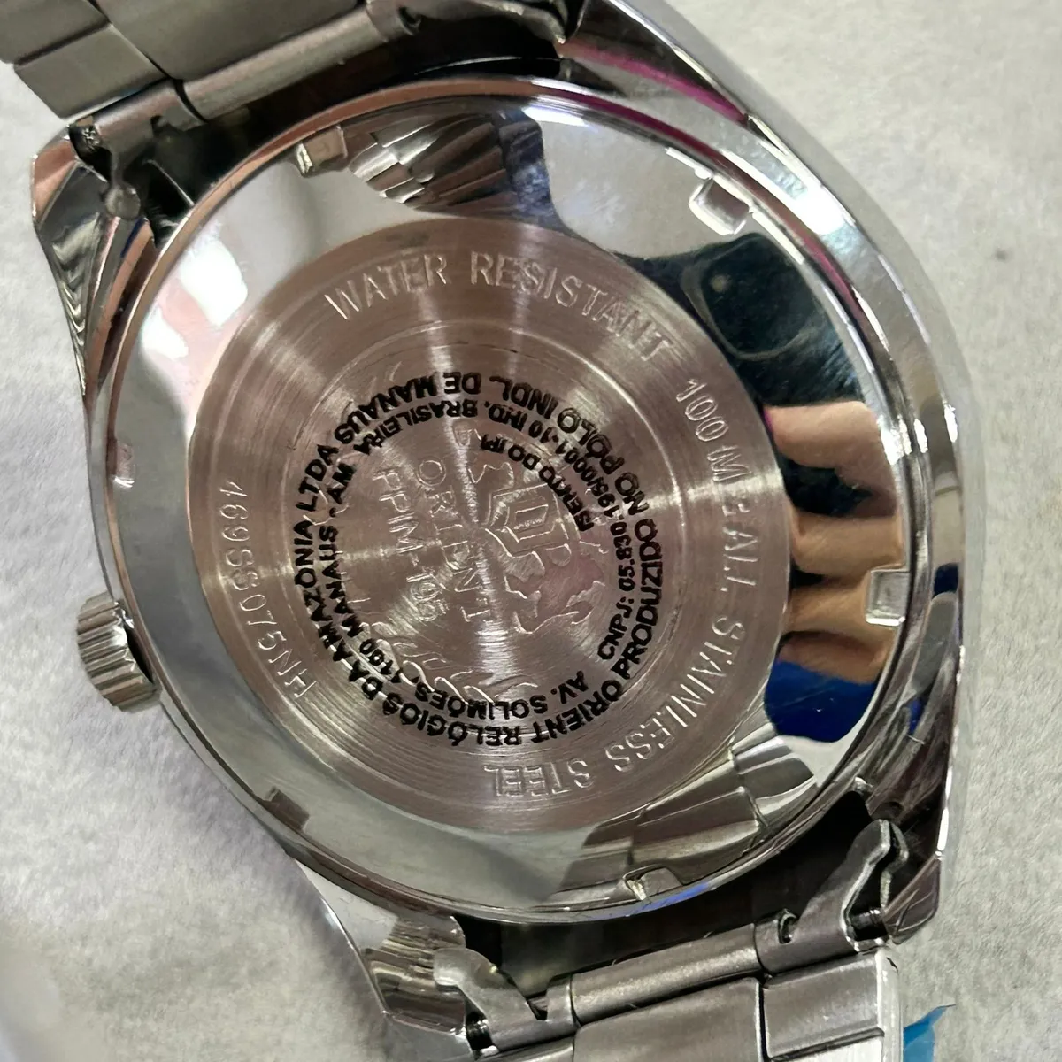 Relógio Orient Automático 3 Estrelas 469SS075NH: Calibre NH36 com corda manual e hacking, caixa 44mm em aço, 100m de resistência e calendário duplo.