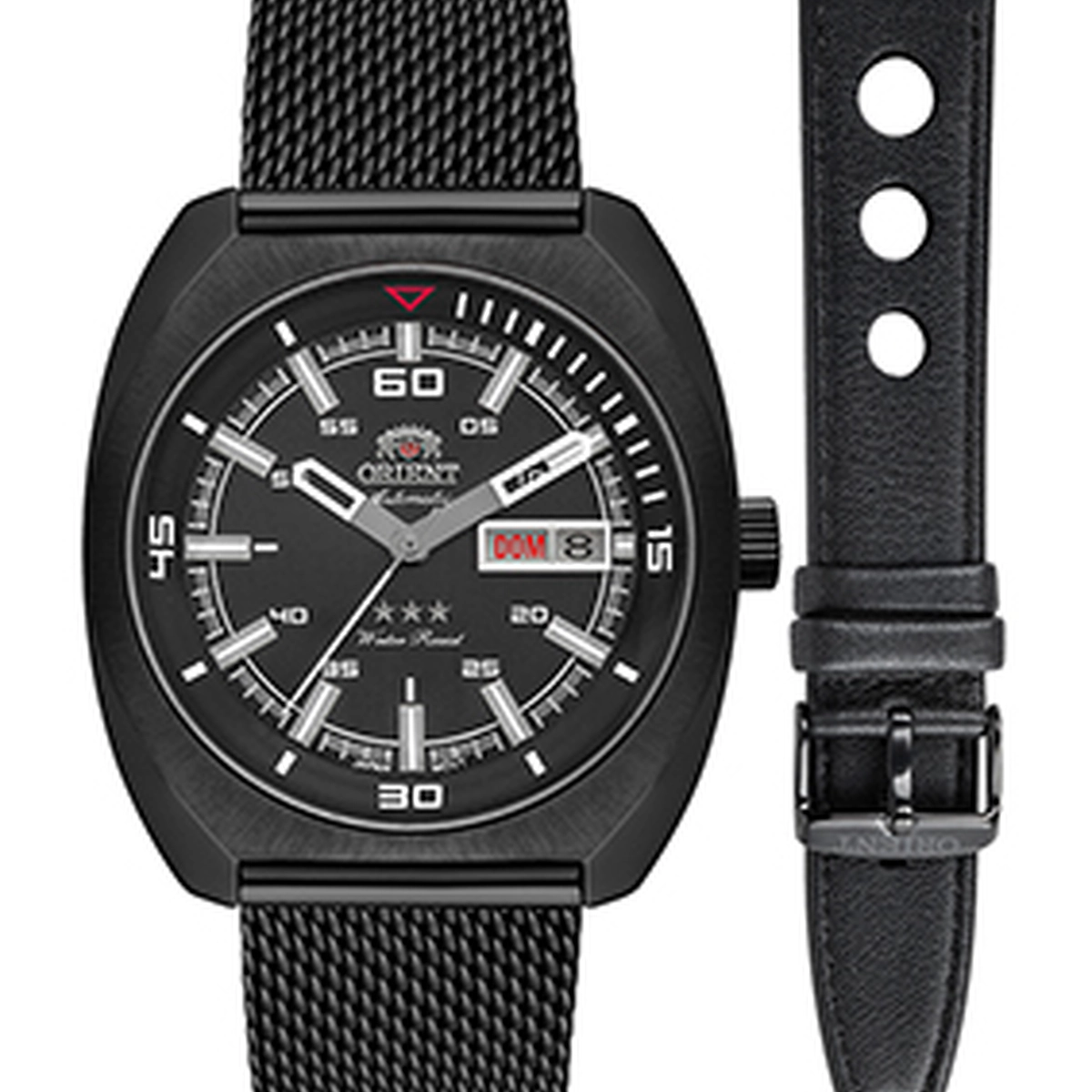 Relógio Orient Automático F49YY023 IP Black: Kit 3 Estrelas com pulseiras Mesh e Couro. Estilo Neo Vintage, calendário duplo e 50m. Compre na Taniguchi!