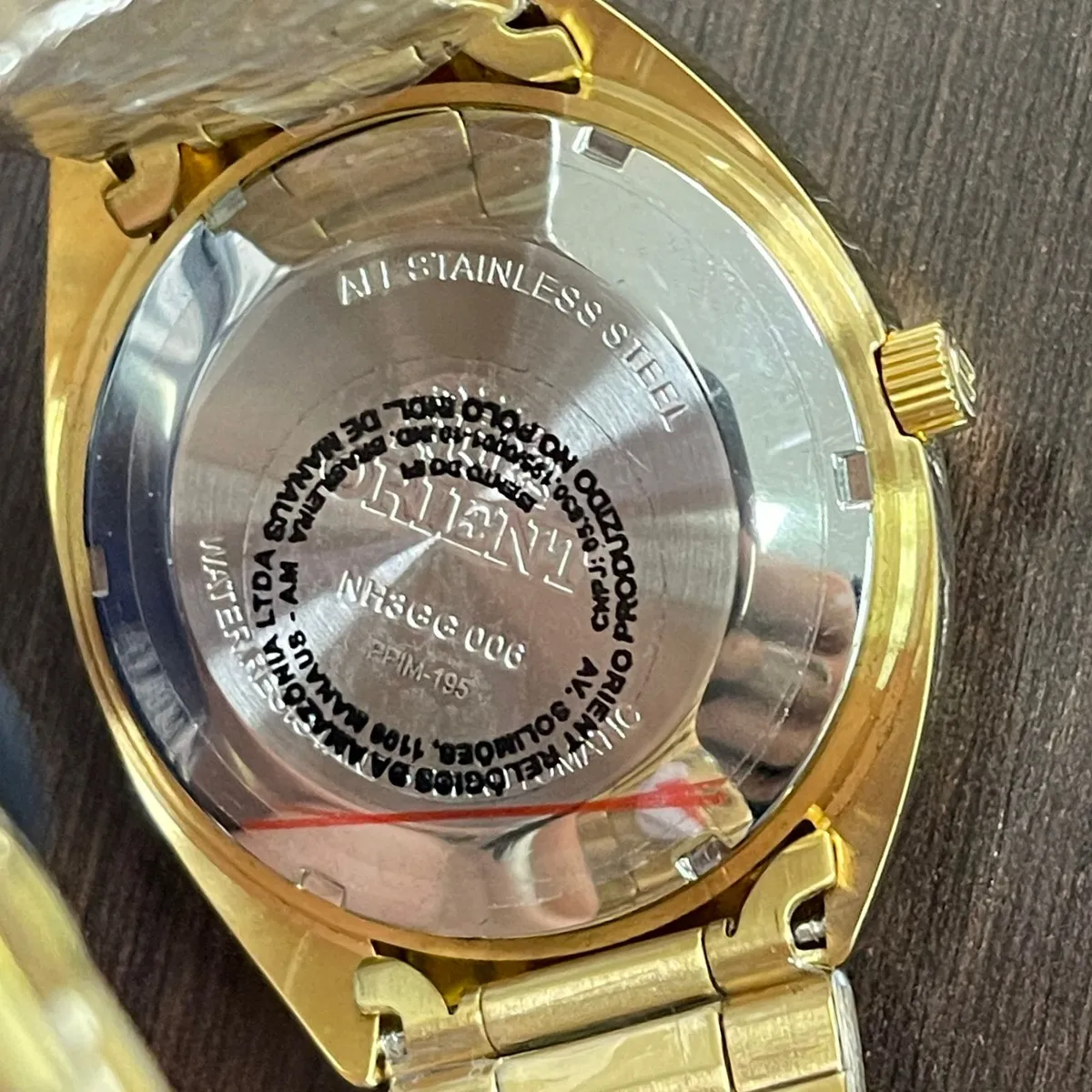 Orient NH3GG006 é um relógio automático dourado com calibre NH36, calendário duplo, resistência de 50m e design clássico da linha Três Estrelas.