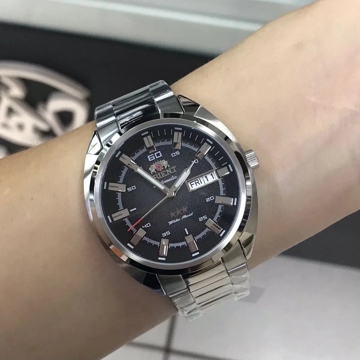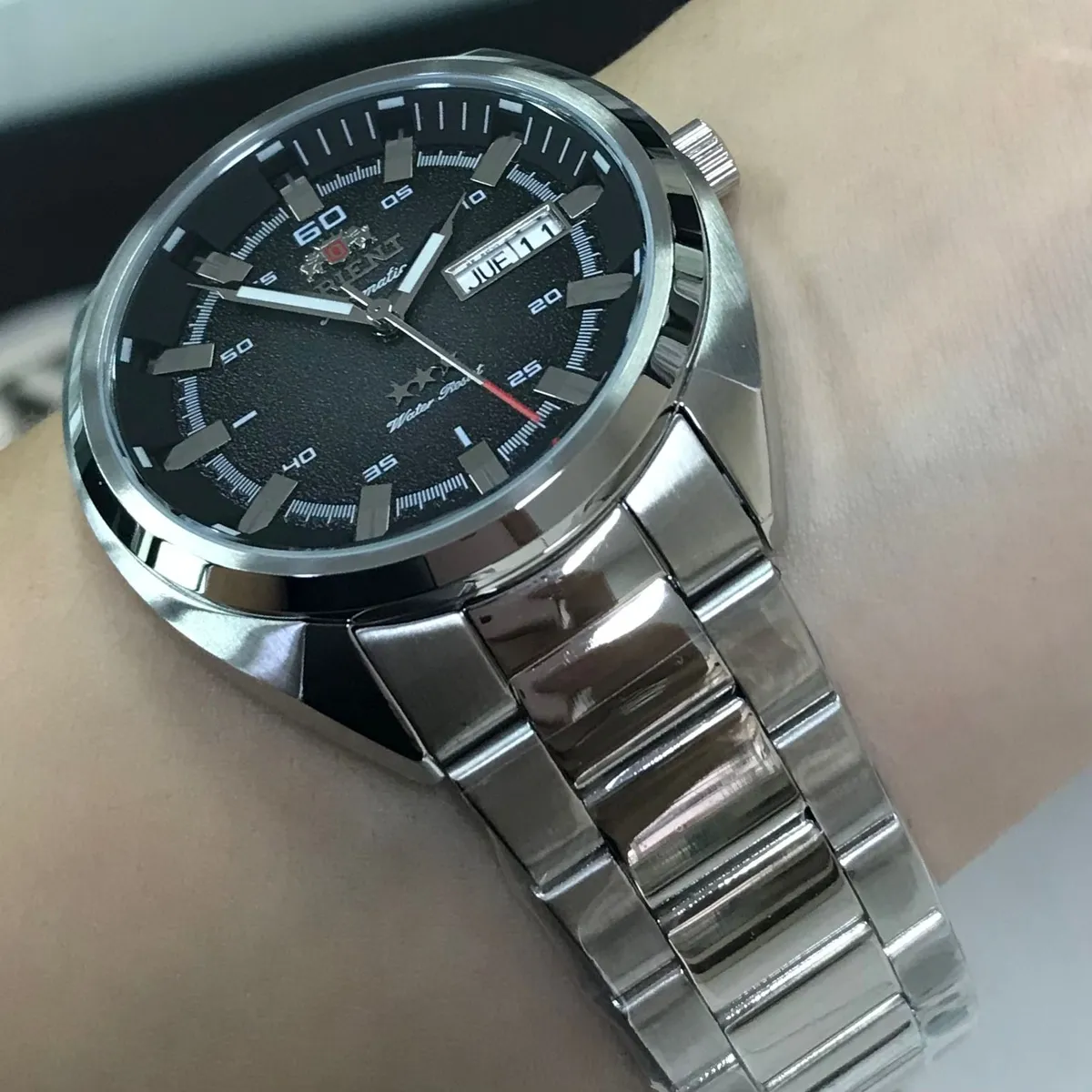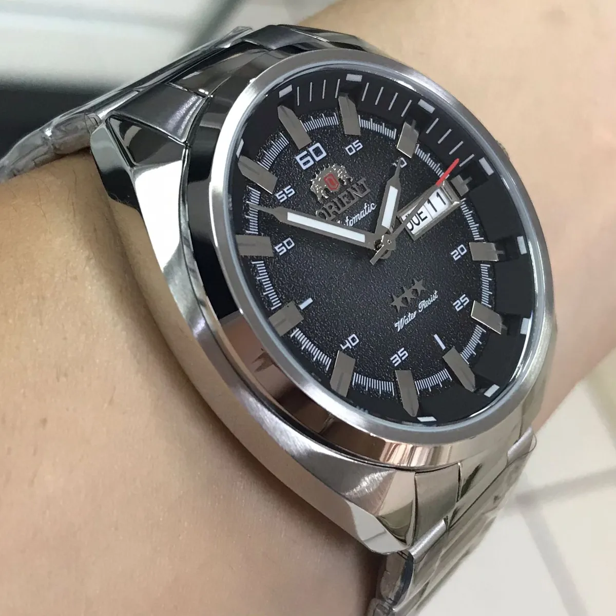 Orient NH3SS007 é um automático clássico em aço, com visor preto, calendário duplo, calibre NH36 com hacking e resistência à água de 50 metros.