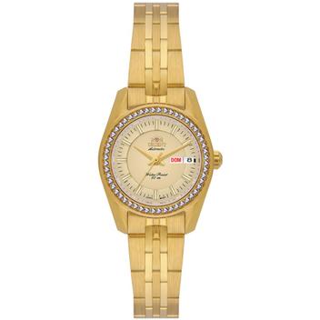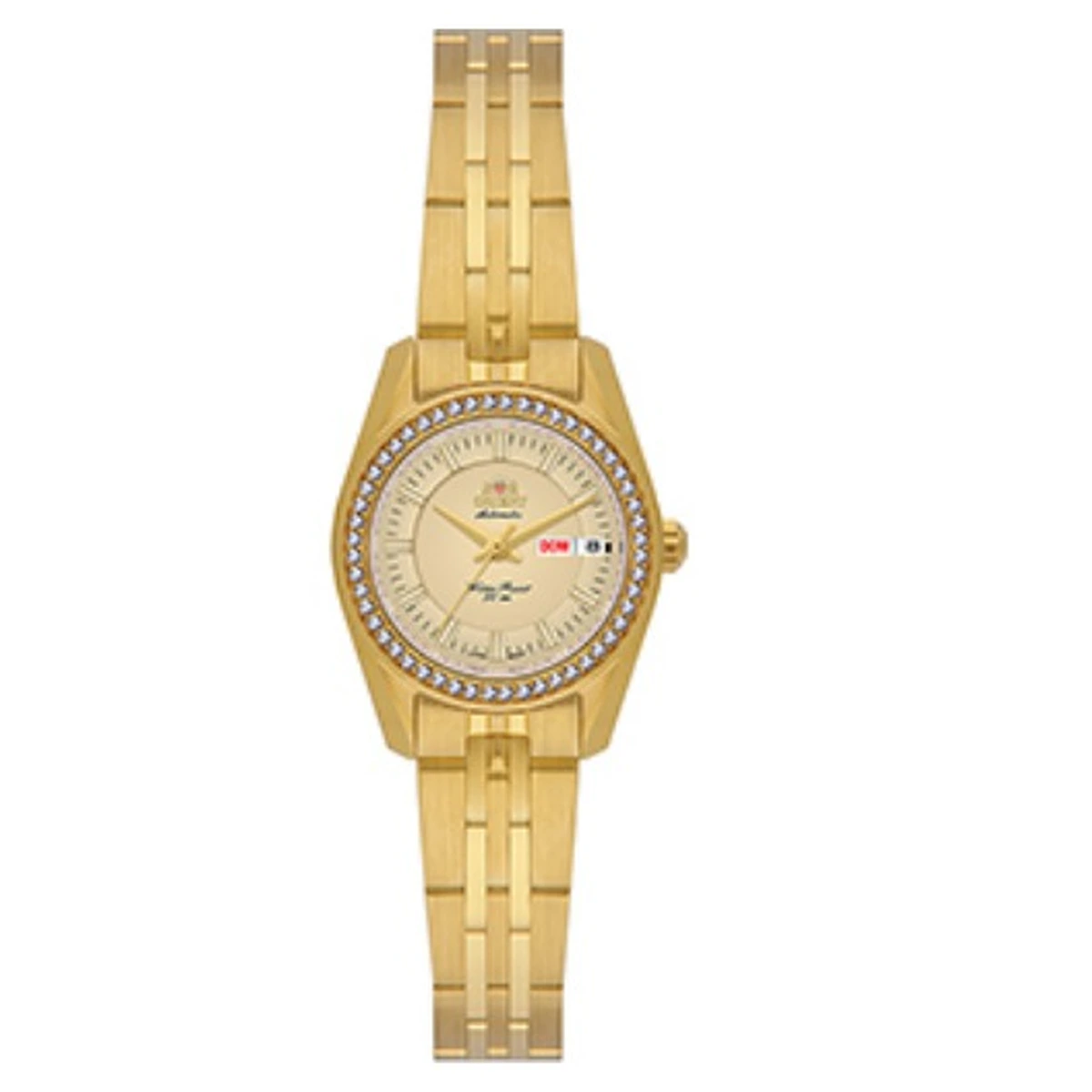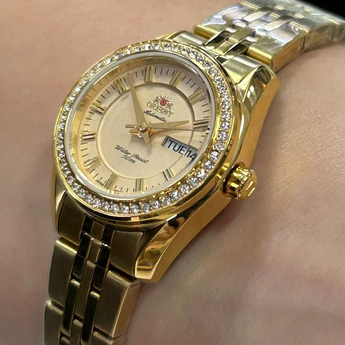 Orient NH6GG006 Automático: Caixa 24mm dourada, mostrador com cristais, calendário duplo e 50m WR. O clássico mecânico feminino na Taniguchi Relógios.