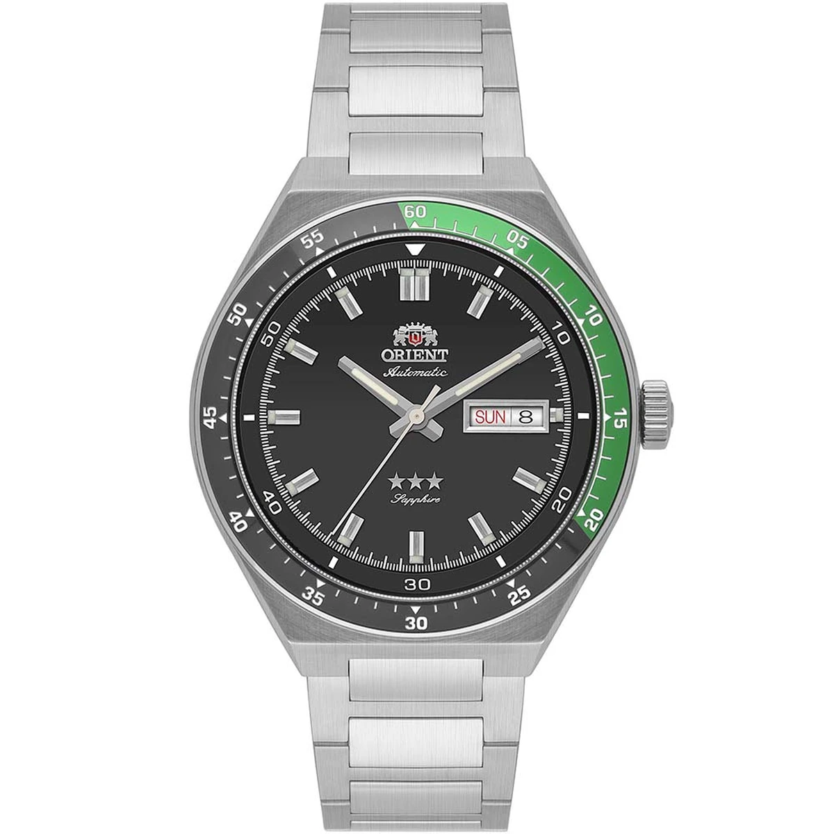 - Estilo Retrô: O design é inspirado nos modelos clássicos da Orient, apresentando uma caixa com linhas limpas e o icônico logotipo de duas mãos segurando o brasão com três estrelas no mostrador.