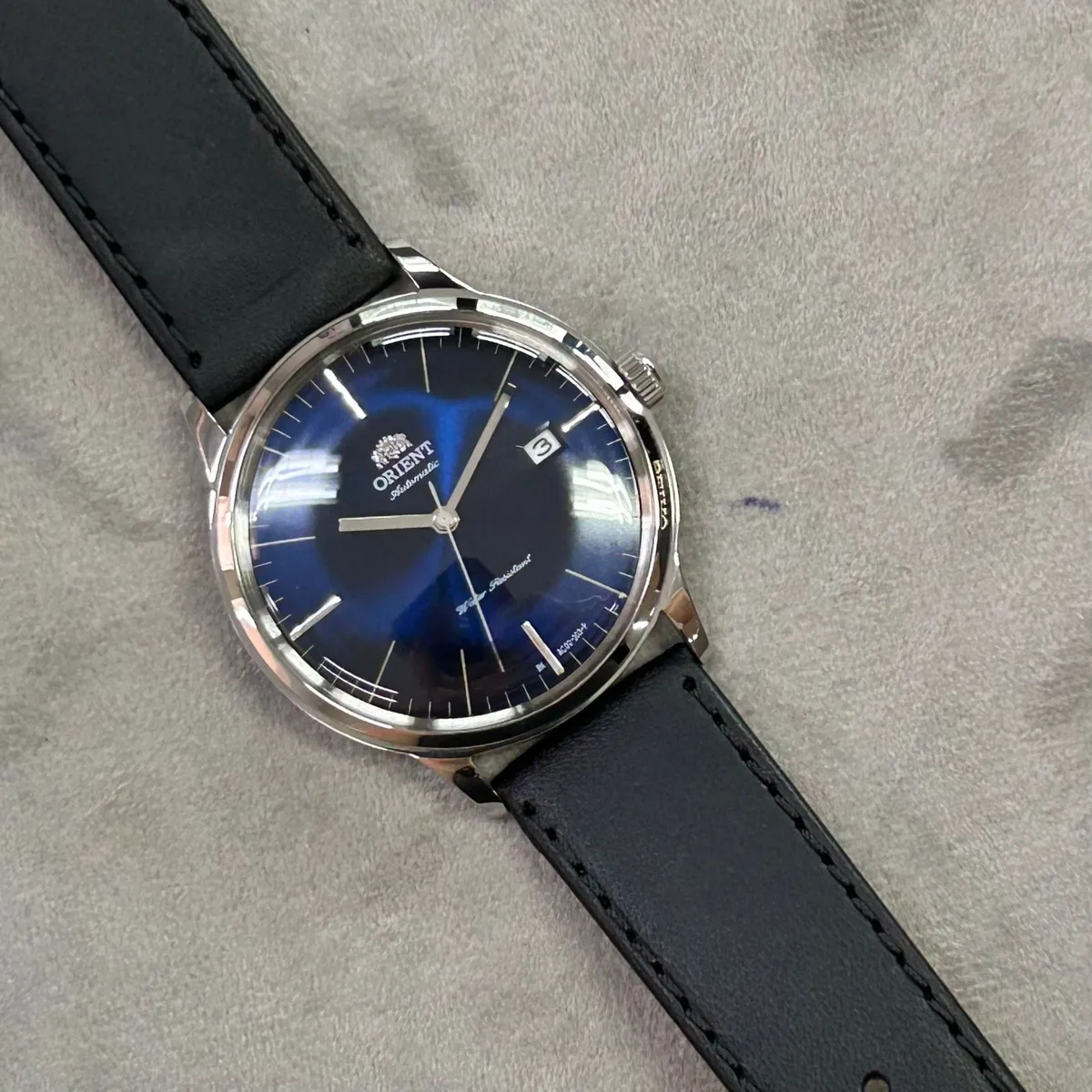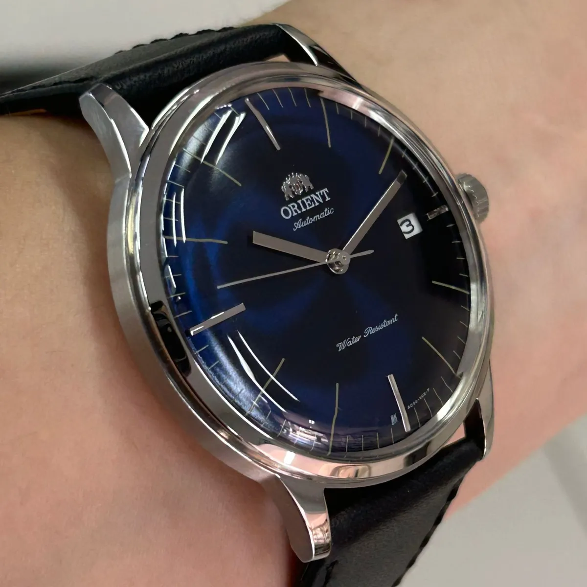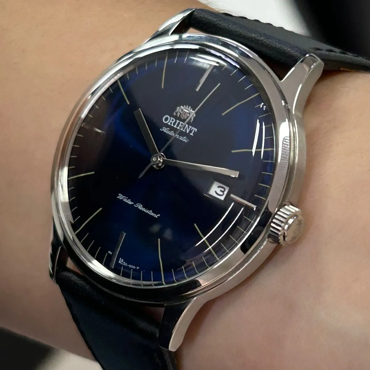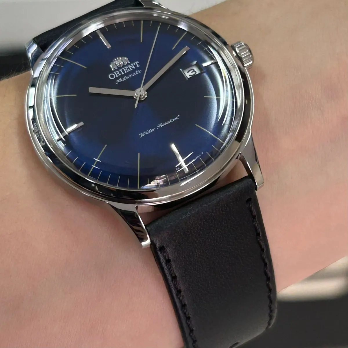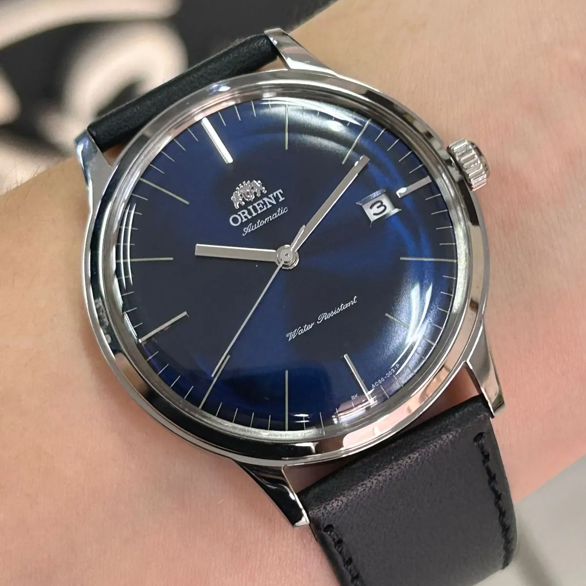 Relógio Orient Bambino TAC0000DD0 Automático Azul: Design minimalista, Calibre F6724 com hacking, cristal bombê e pulseira de couro. Original.