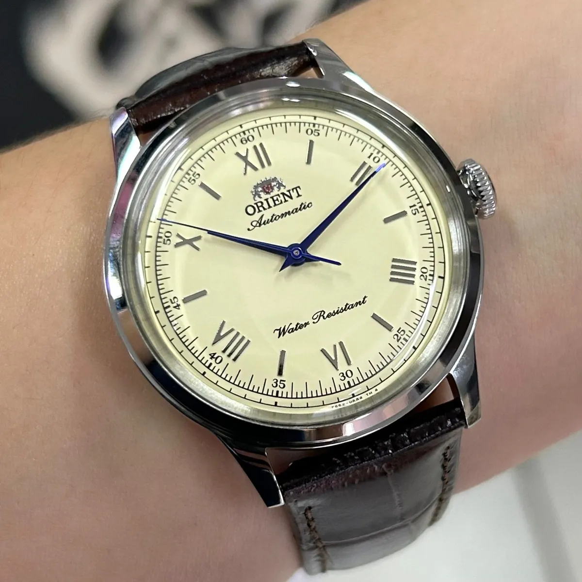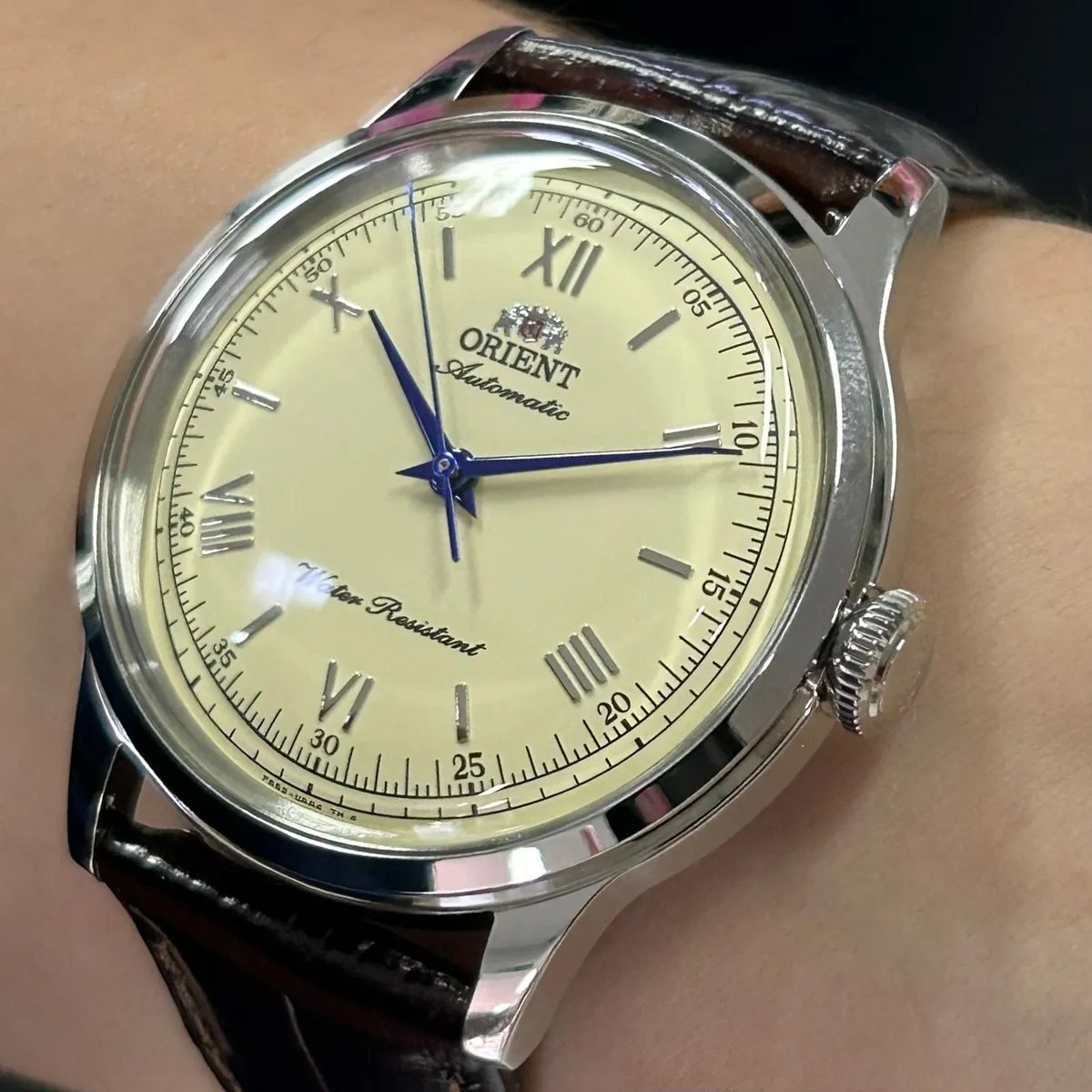 Com um diâmetro de 38,4mm e um lug-to-lug contido de 44,0mm, este Bambino oferece uma das melhores experiências de uso da categoria. Ele se centraliza perfeitamente no pulso e desliza com facilidade sob o punho de camisas sociais. A pulseira de couro marrom com textura clássica completa o conjunto, oferecendo conforto imediato. Com resistência à água de 30 metros (3 ATM), o RA-BB0003Y30B está protegido contra os imprevistos do cotidiano, mantendo a segurança do seu mecanismo automático.