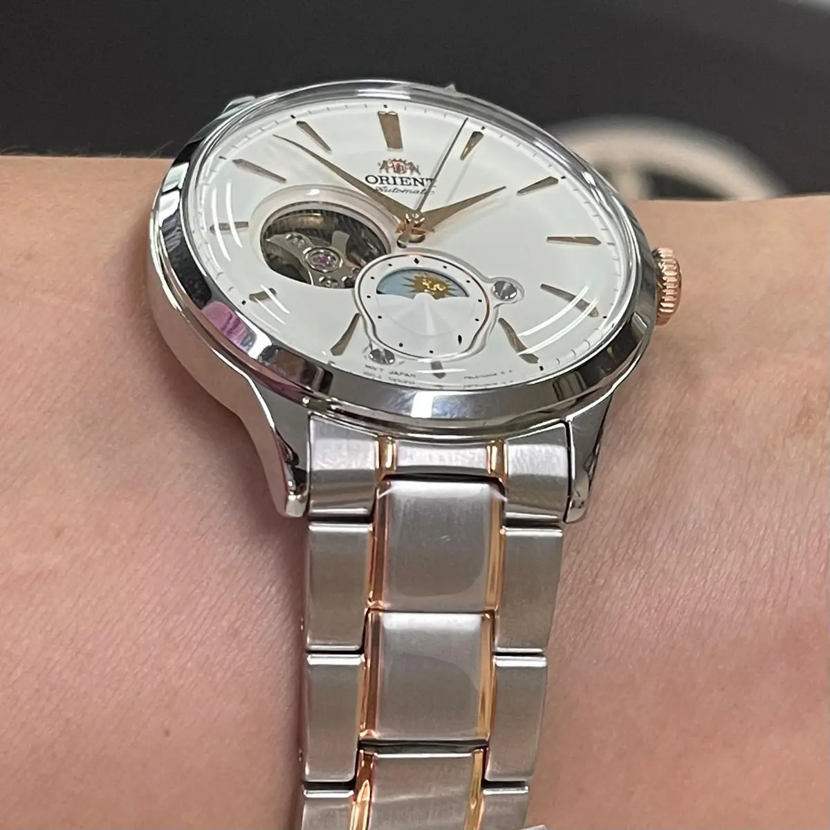 - Material da Pulseira: Aço Inoxidável (Bicolor Prata/Ouro Rosa)