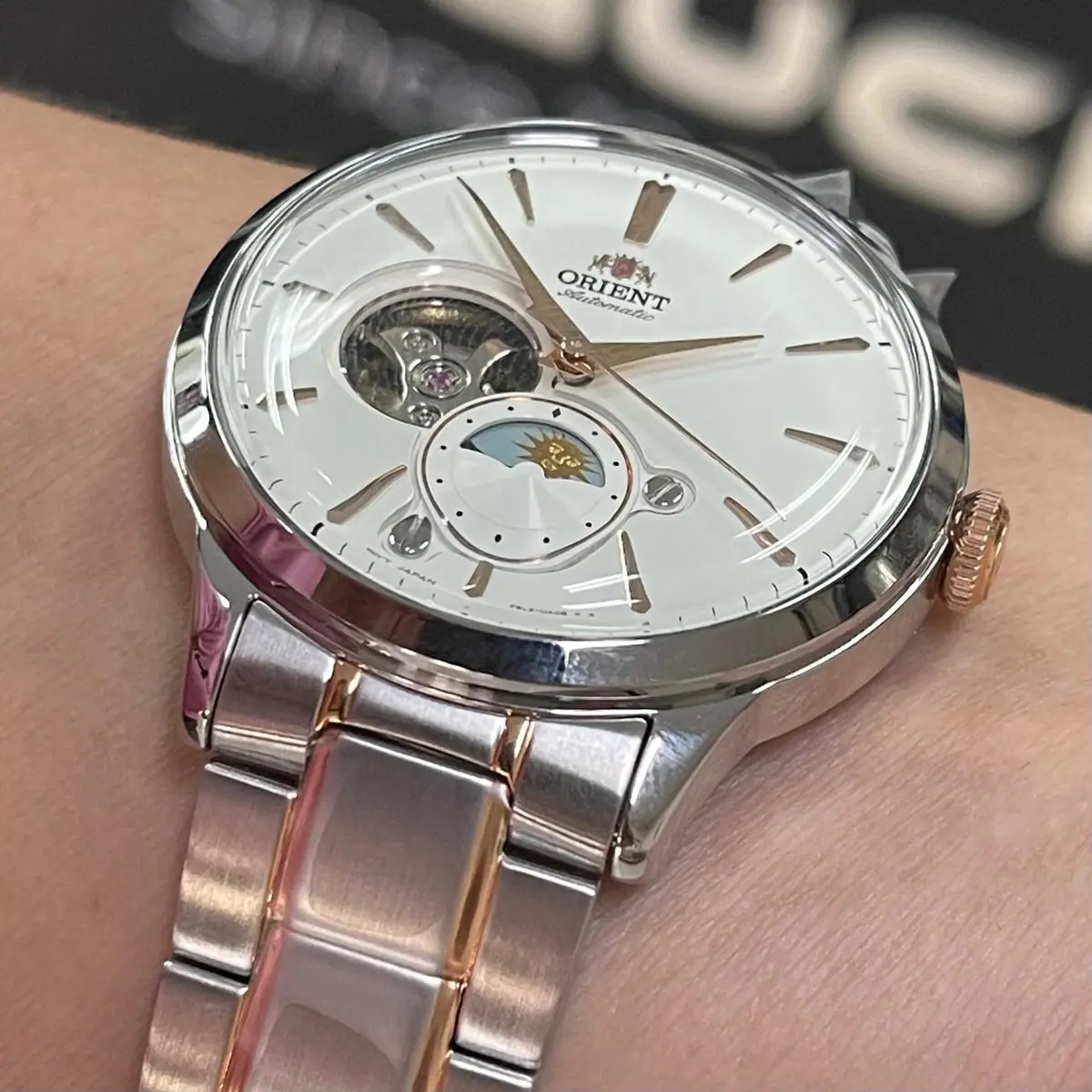 O grande destaque deste modelo é o seu mostrador branco trabalhado, que abriga a complicação Sun & Moon (Sol e Lua) entre as posições de 4 e 6 horas. Este disco giratório ilustra a transição do dia para a noite, conferindo um charme poético e funcional ao pulso.