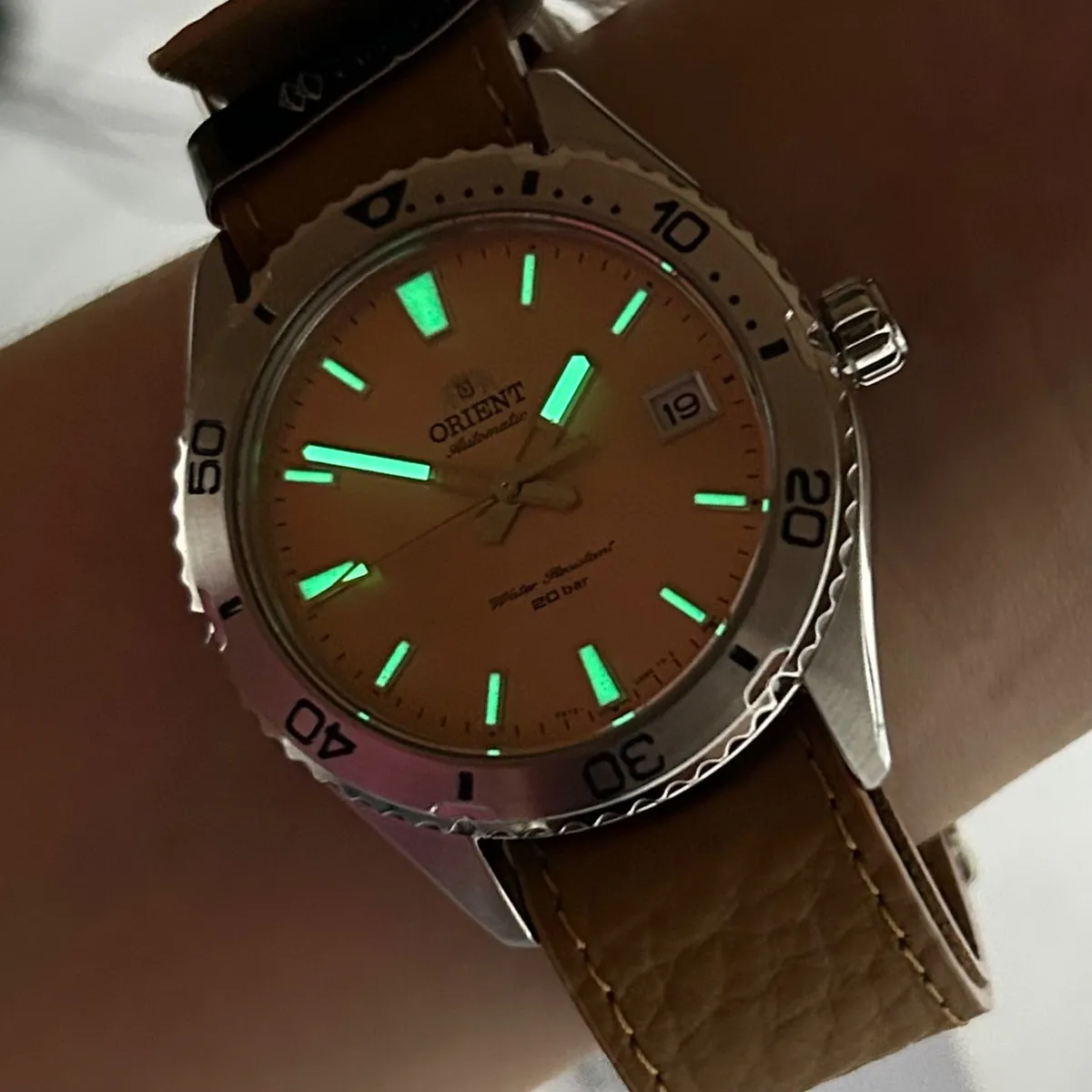 - Mostrador Exclusivo: Cor abricó com ponteiros e índices luminescentes para visibilidade em ambientes com pouca luz.