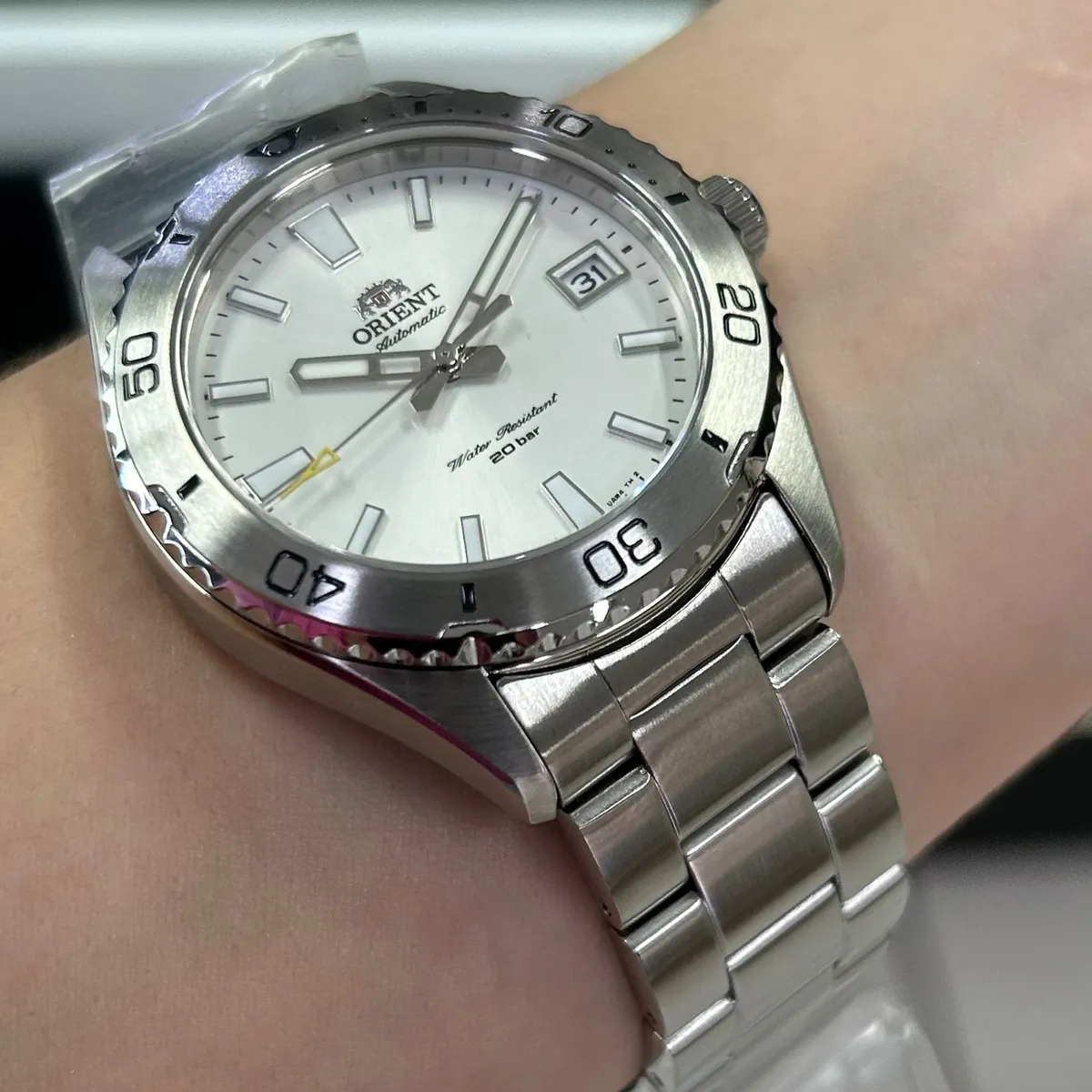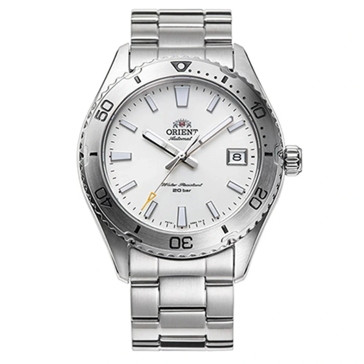 Relógio Orient Mako 40 RA-AC0Q03S30B Automático com Safira, mostrador branco e 200m. Design compacto e mecânico japonês original na Taniguchi Relógios.