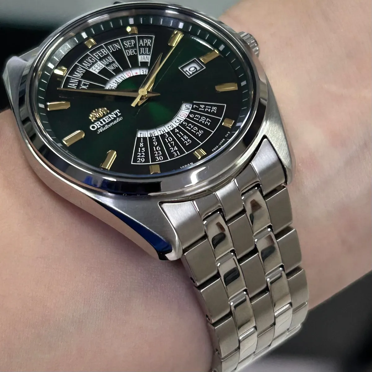 O grande diferencial deste modelo é a sua complicação de Calendário Multi-Year (Multianual). Através de um disco engenhoso no mostrador, você consegue visualizar o calendário completo de qualquer mês e ano, uma funcionalidade clássica da Orient que encanta gerações.