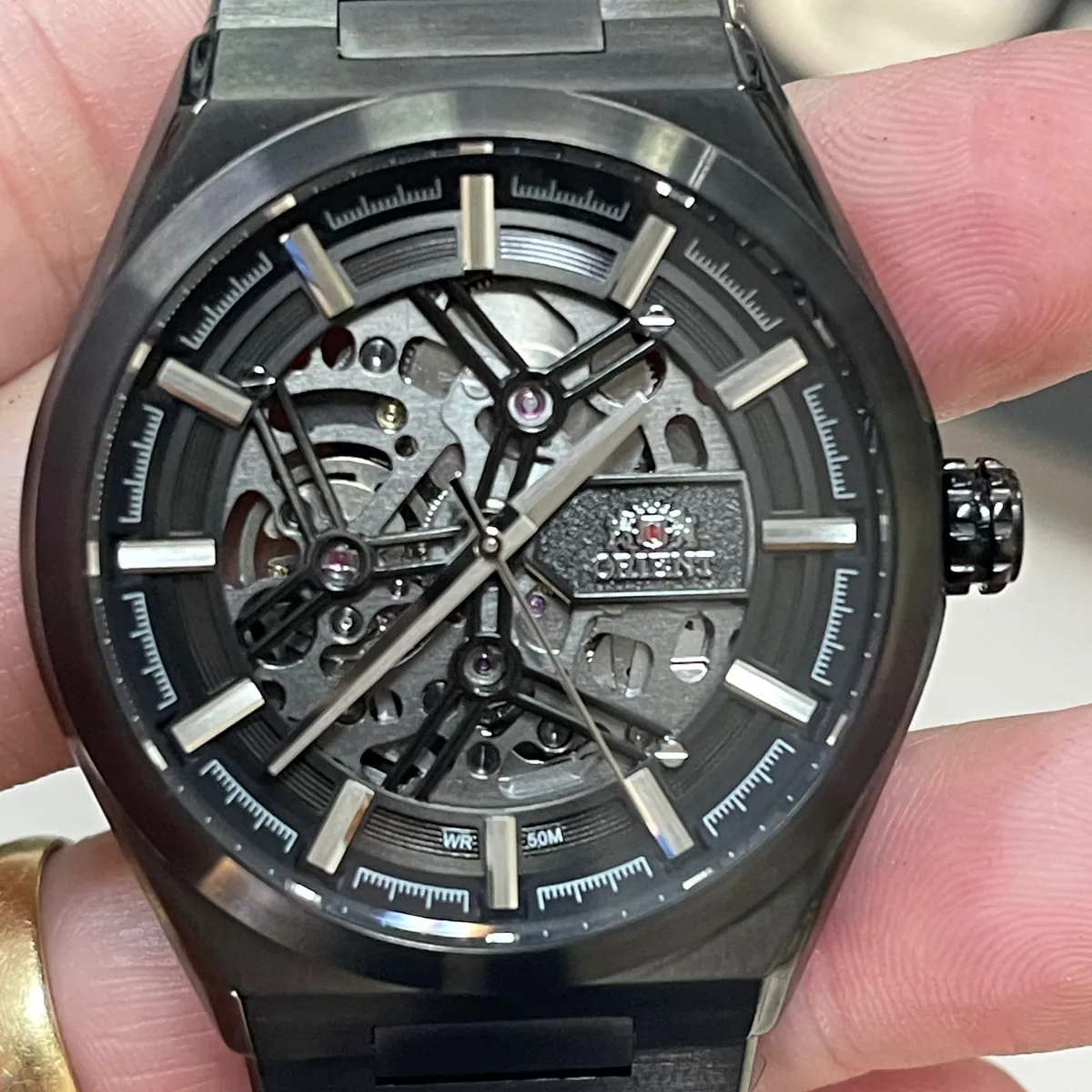 Orient NH7YY001 é um automático skeleton em aço IP Black com calibre NH7, 24 rubis e mostrador vazado que expõe seu mecanismo sofisticado de 42mm.