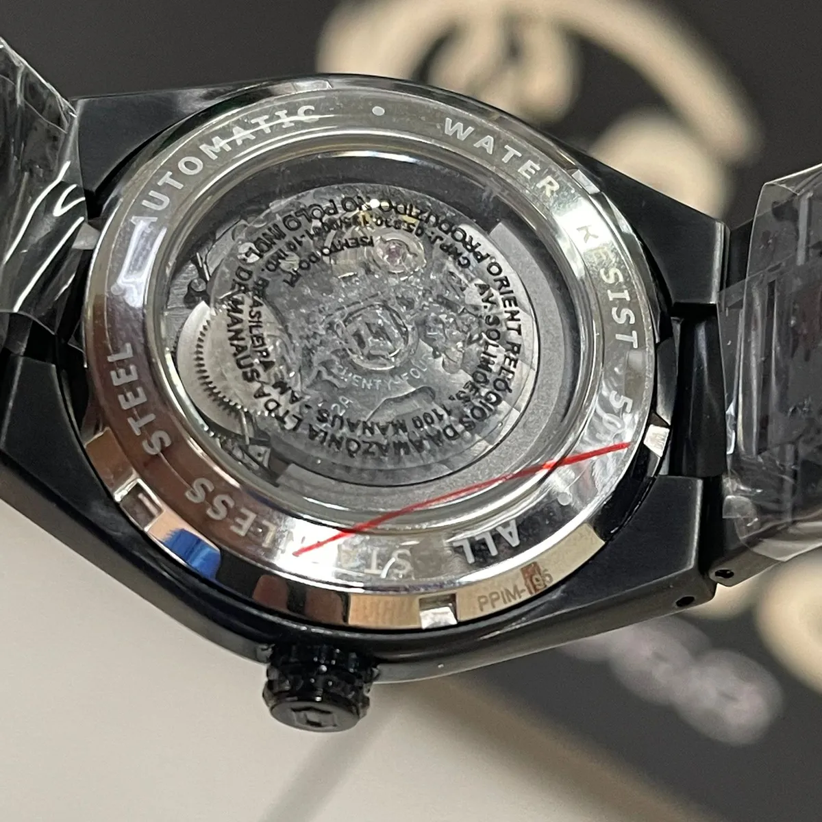- Pulseira: Também em aço inoxidável com o mesmo acabamento preto da caixa e fecho dobrável com trava.