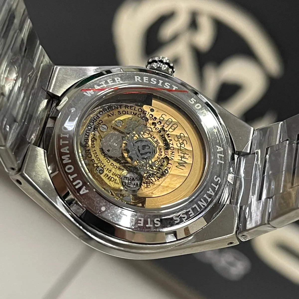 - Fundo: Possui tampa posterior transparente (parafusada), permitindo a visão completa do rotor e do maquinário também pela parte de trás do relógio.