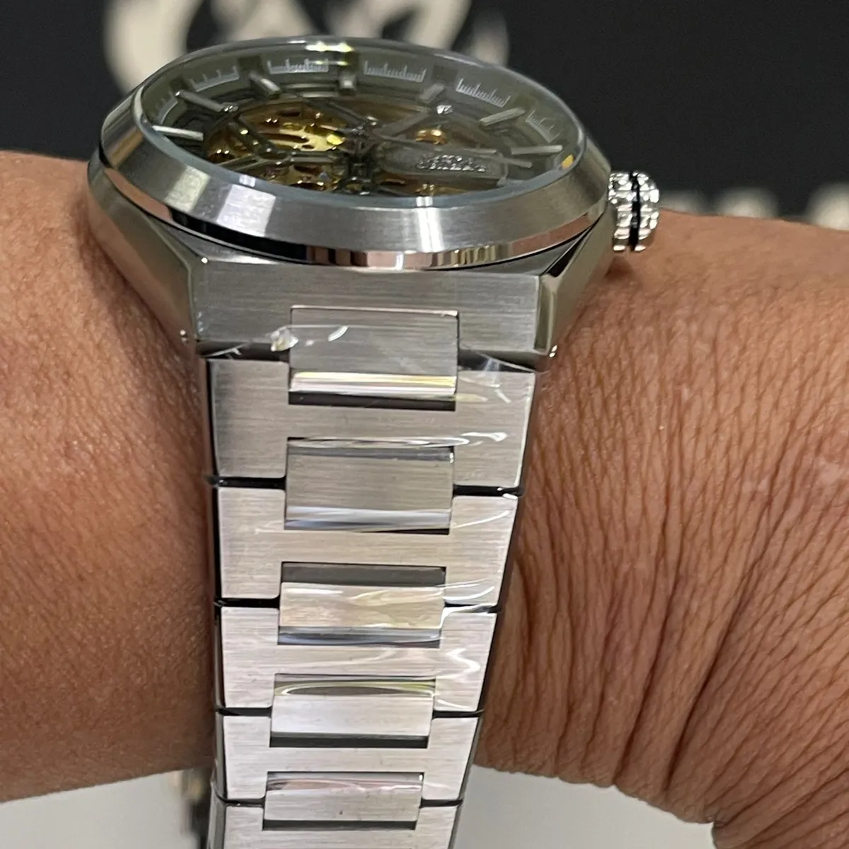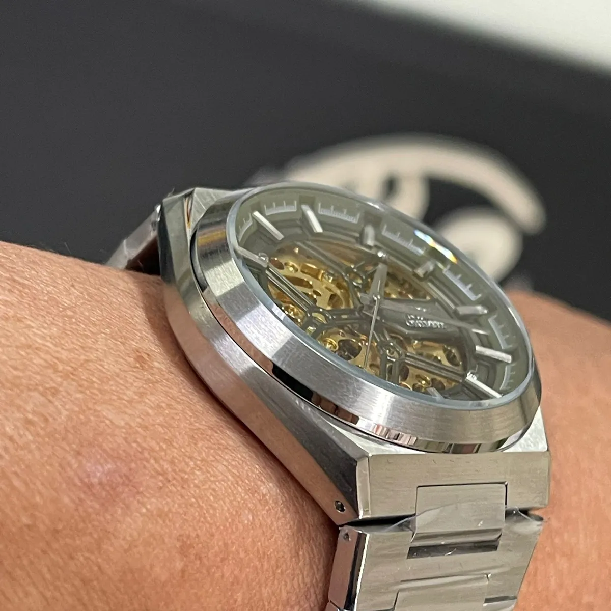 - Caixa: Construída inteiramente em aço inoxidável polido e escovado, com um diâmetro de aproximadamente 42 mm, conferindo uma presença robusta e elegante no pulso.