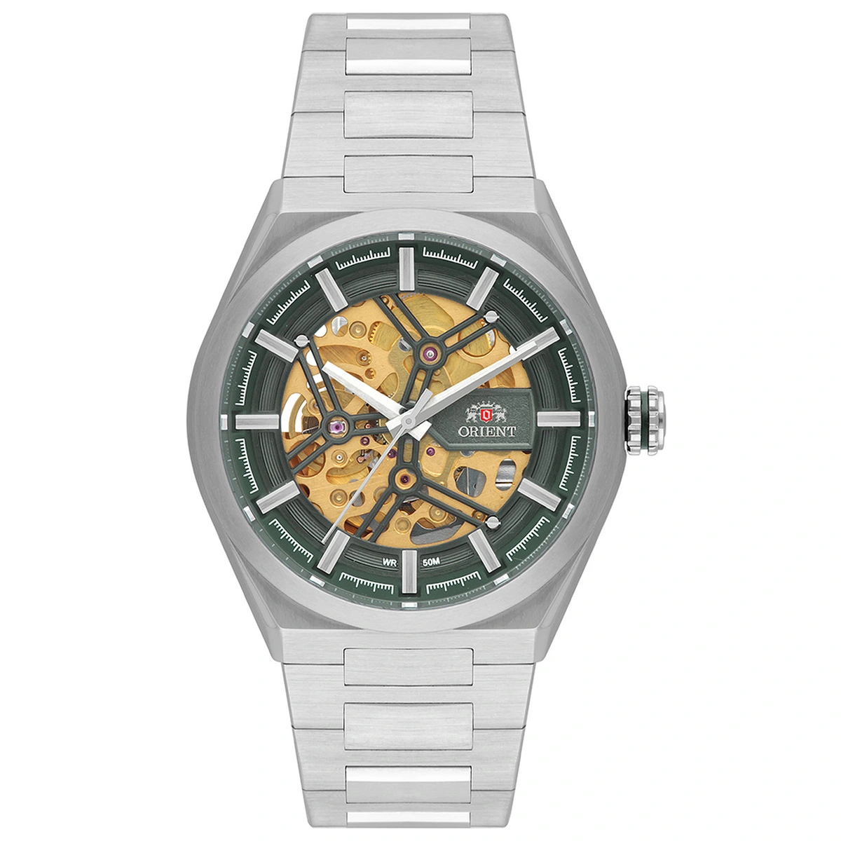 Orient NH7SS005 é um automático Skeleton verde em aço, com mecanismo à vista, função hacking, corda manual e resistência de 50 metros.