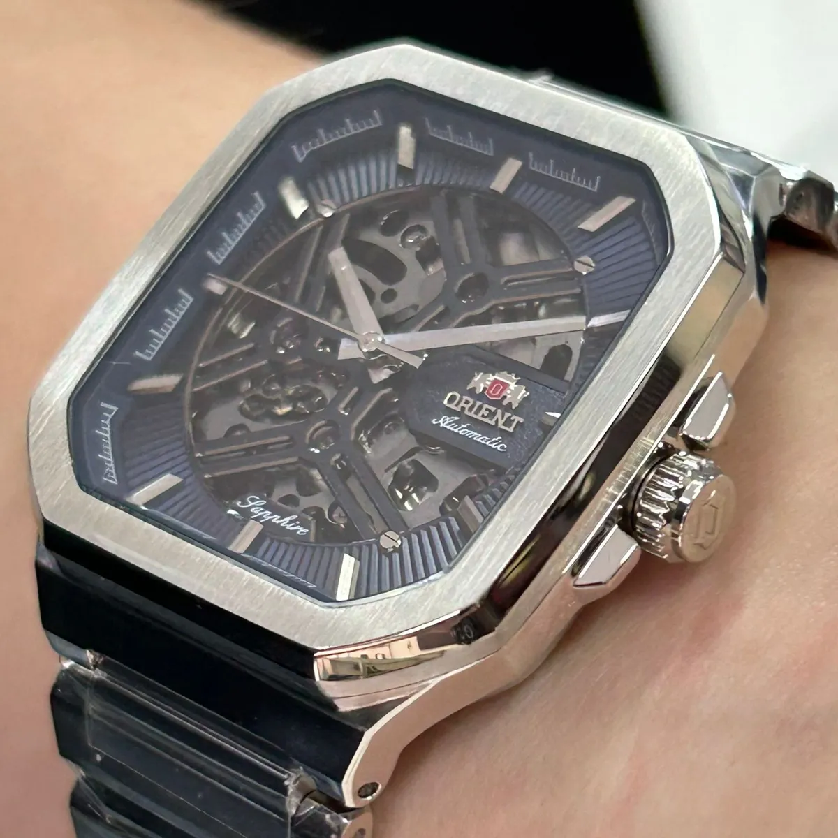 Relógio Orient Automático Skeleton NH7SS008 D1SX: design vazado sofisticado em aço inox, calibre NH7 de alta precisão e resistência de 50m. Elegante!