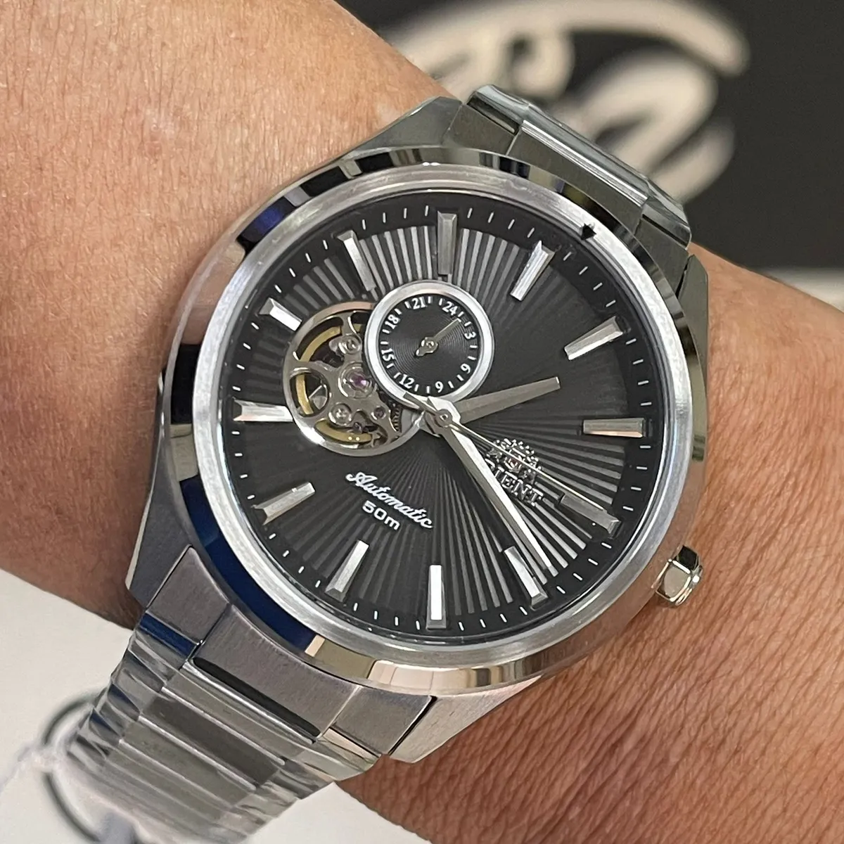 Orient NH3SS005 é um automático clássico em aço com design "Open Heart", subdial de 24h e fundo transparente, unindo sofisticação e precisão.