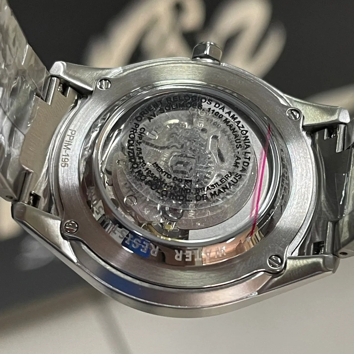 - Fundo: Possui tampa rosqueada transparente (case back), permitindo visualizar o maquinário por completo na parte de trás.