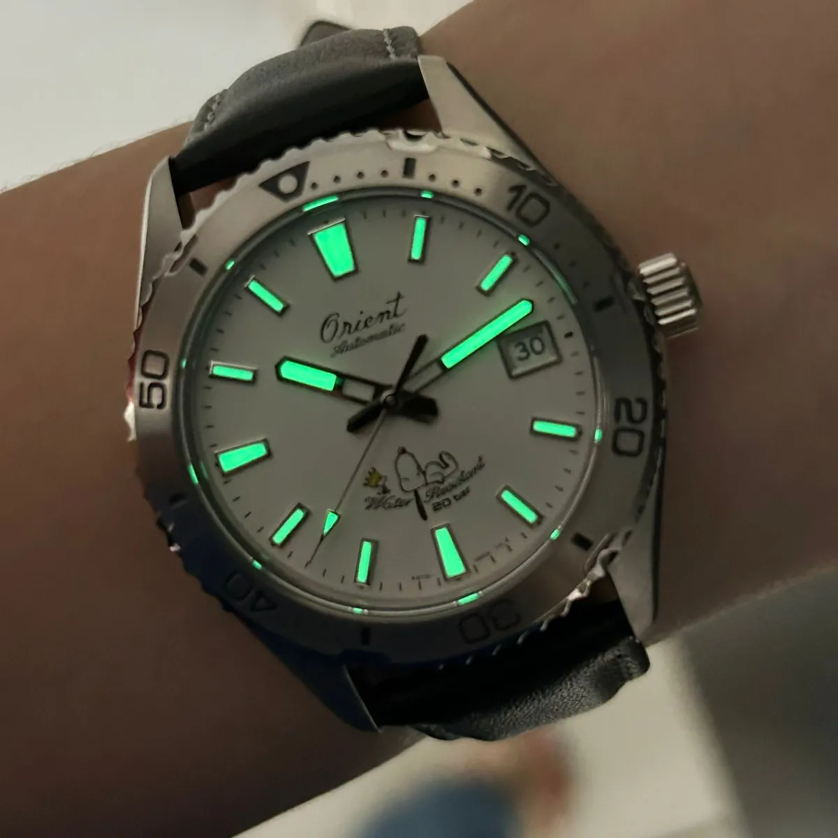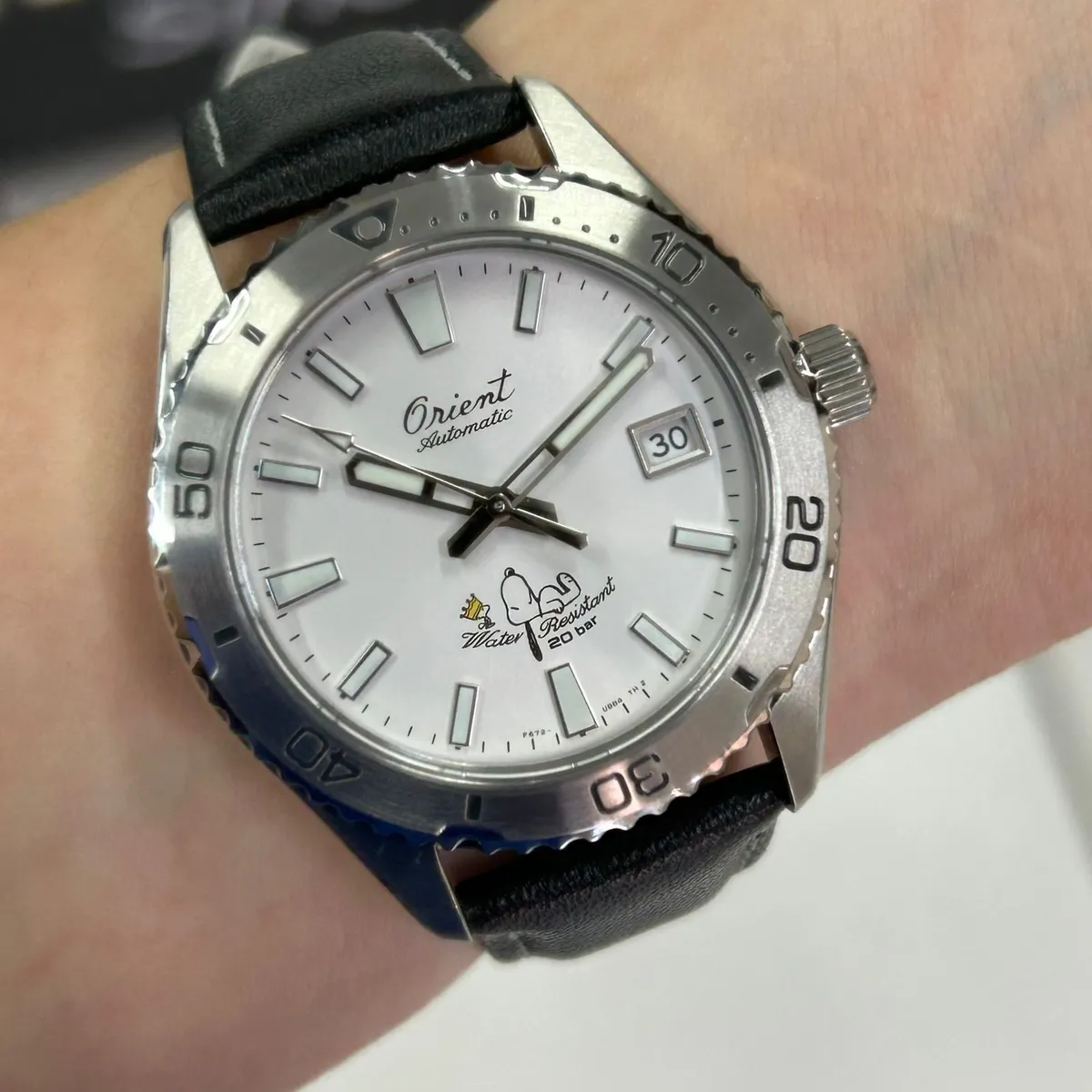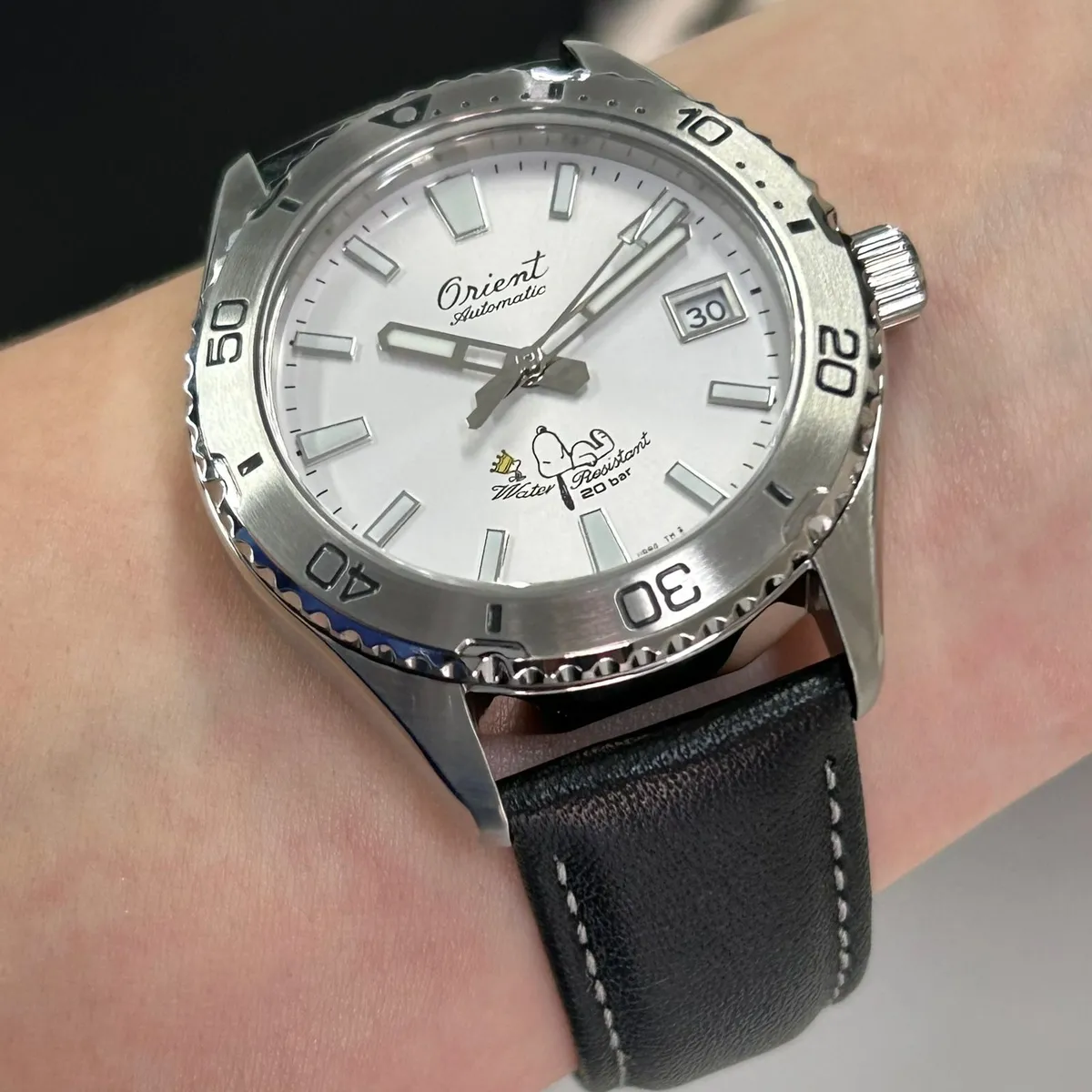 relógio identificado pelo código RA-AC0Q08S30B é o Orient Mako 40 Peanuts 75th Anniversary Limited Edition, uma edição especial e limitada a 3.800 unidades produzida para celebrar o 75º aniversário da franquia Peanuts (Snoopy).