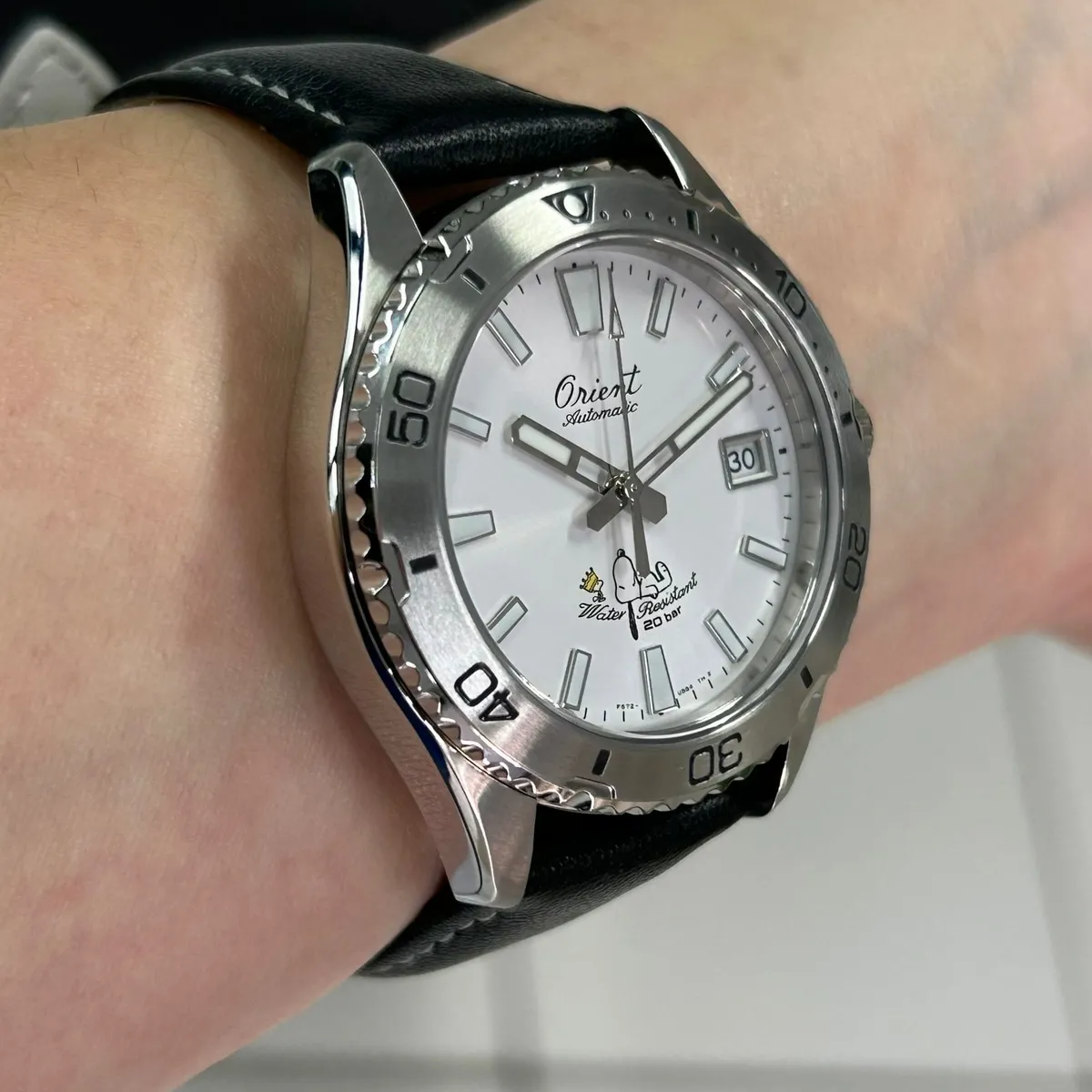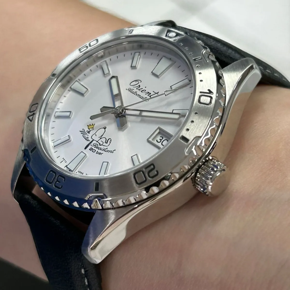 Relógio Orient Mako 40 Peanuts 75th Anniversary RA-AC0Q08S30B Automático, Safira, 200m, Edição Limitada Snoopy com pulseira de couro e mostrador branco.