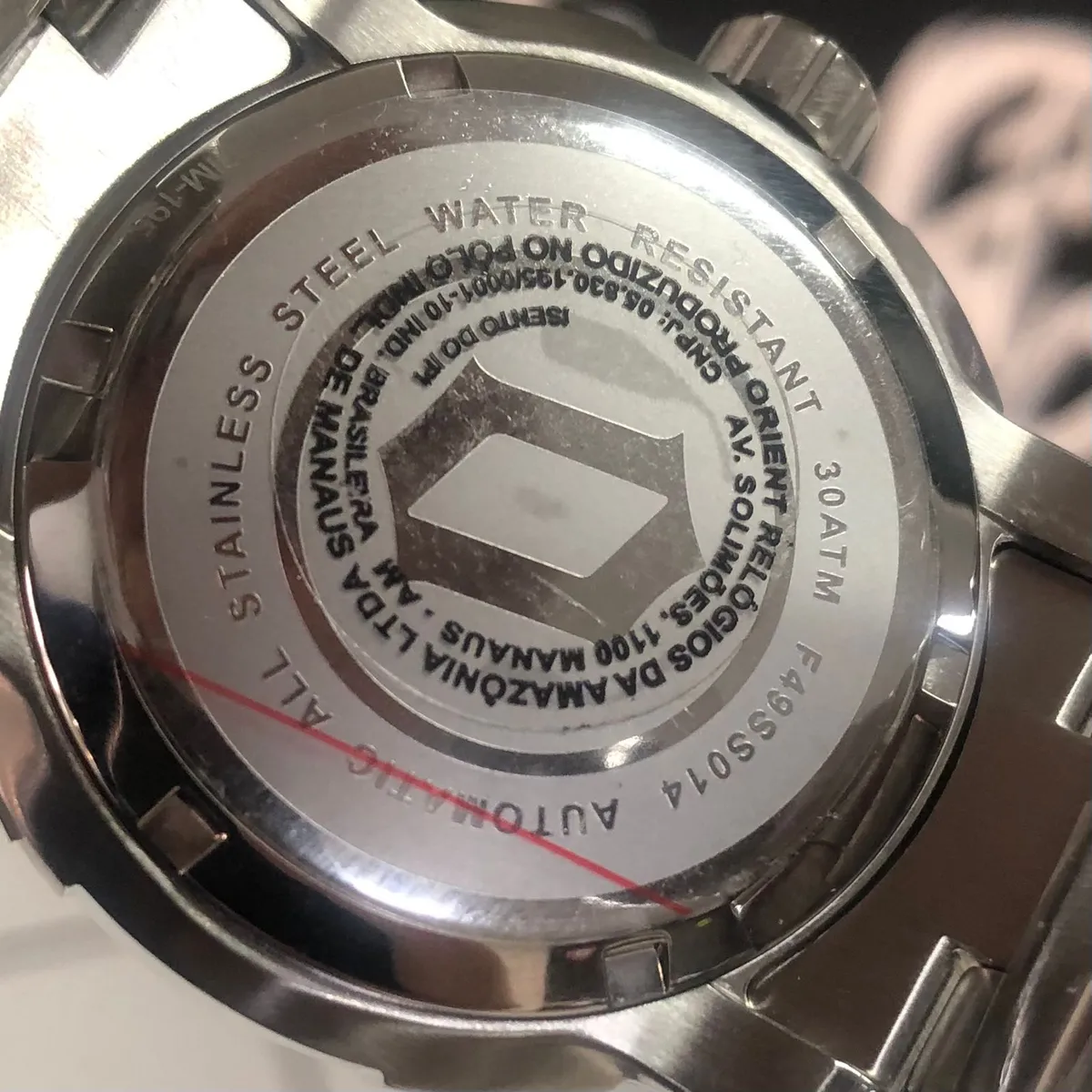 - Calibre: Movimento automático Orient F49 (produzido no Japão).