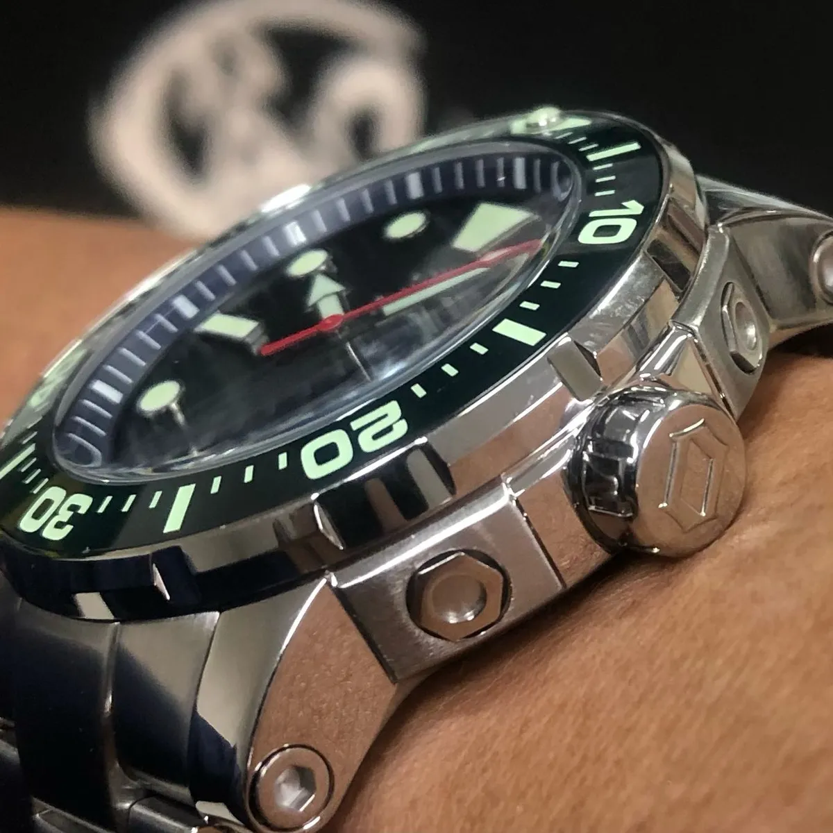 - Caixa: Fabricada em aço inoxidável 316L, com acabamento polido e escovado. Possui um diâmetro de aproximadamente 42 mm e uma espessura robusta para suportar pressões subaquáticas.