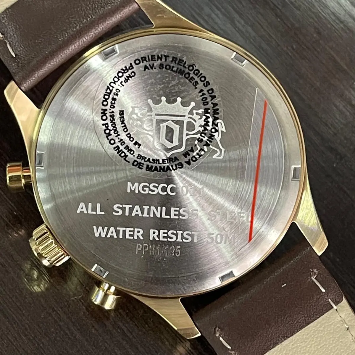 Relógio Orient SolarTech MGSCC011: Cronógrafo masculino dourado com pulseira de couro e carga solar. Estilo e precisão na Taniguchi Relógios. Confira!