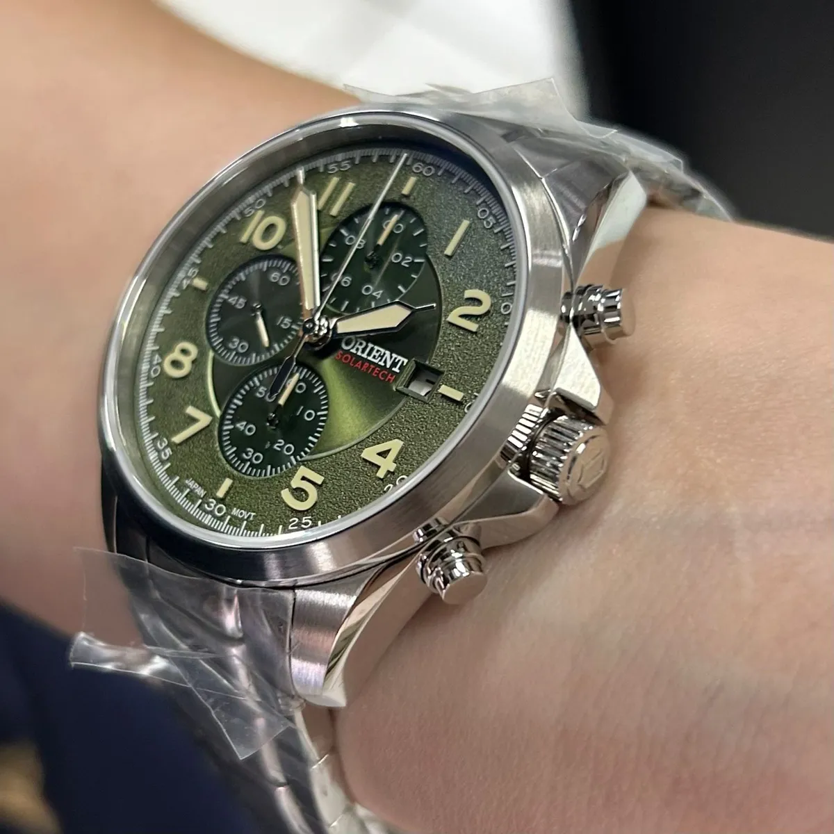 Orient Solartech MBSSC302 é um cronógrafo em aço com vidro de safira e carregamento solar, unindo resistência e tecnologia esportiva em 40mm.
