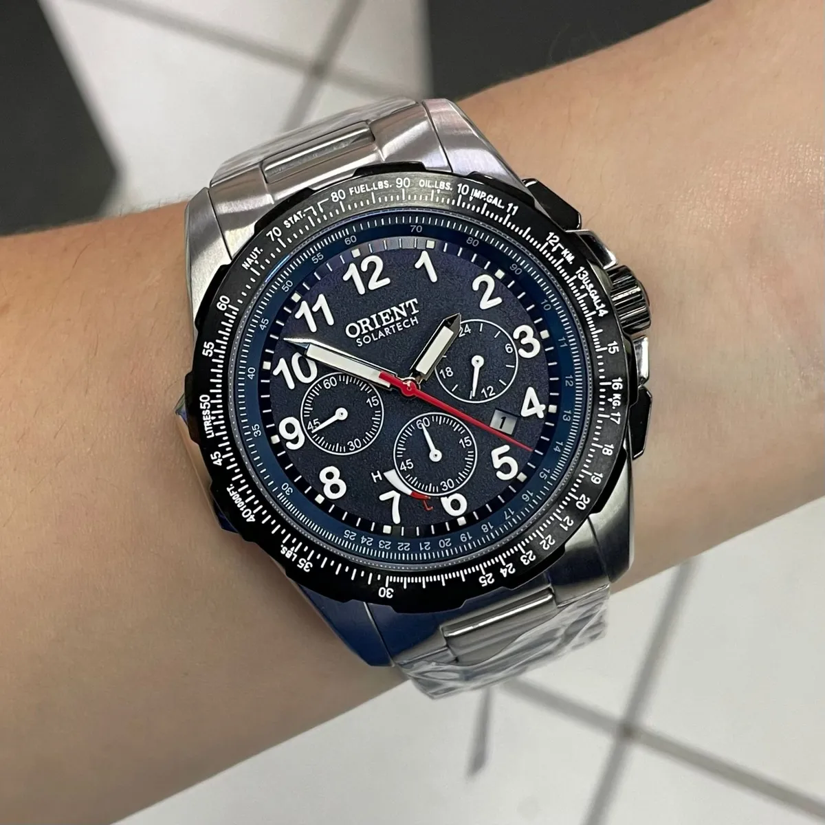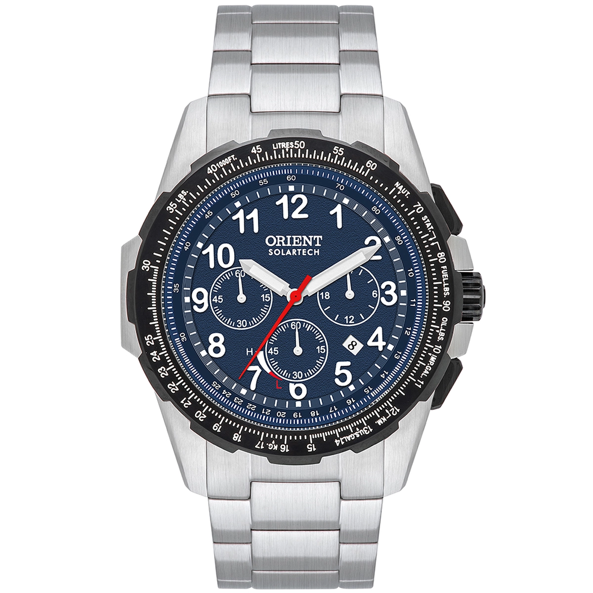 Orient Solartech MBSSC289 é um cronógrafo solar estilo aviador com vidro de safira, caixa em aço e resistência de 100m, unindo precisão e resistência.
