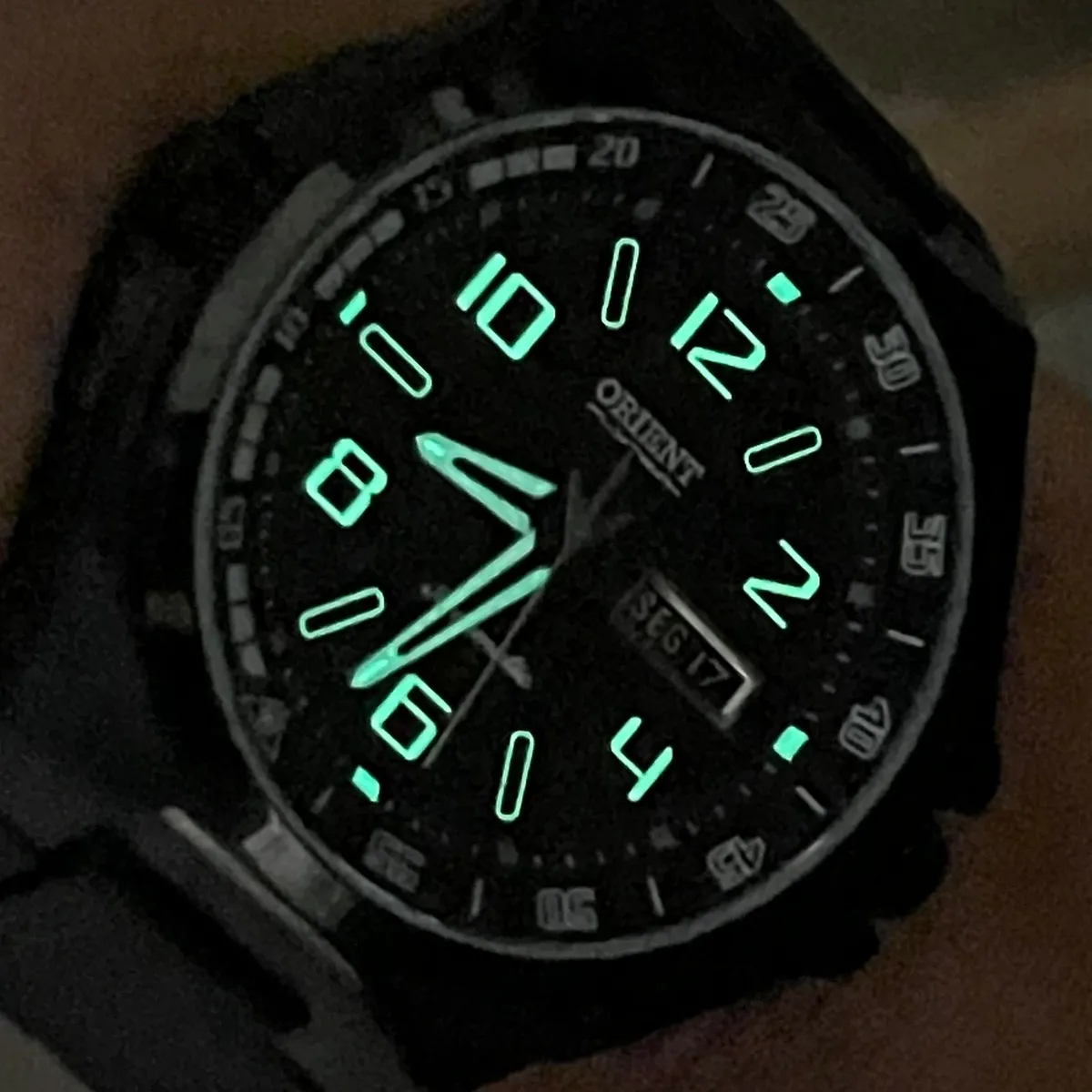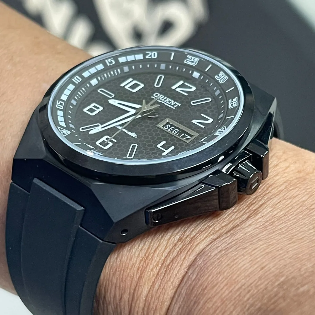 - Mostrador e Visibilidade: Possui mostrador preto com textura hexagonal, ponteiros e índices com material luminescente para leitura em ambientes escuros.