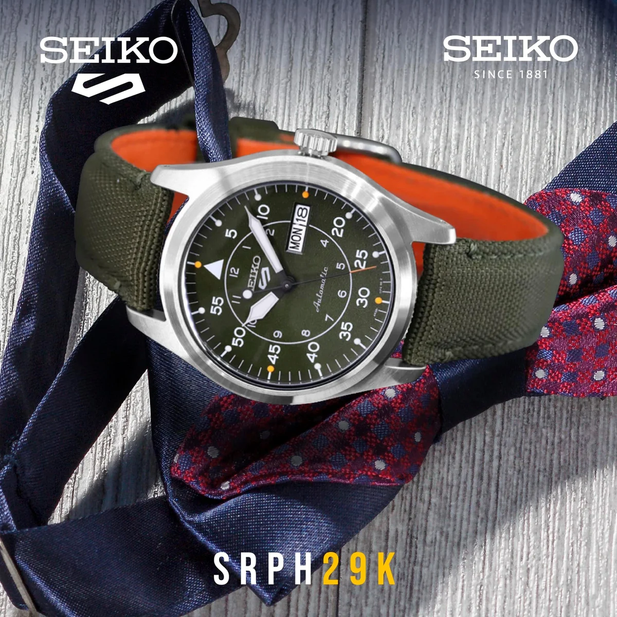 Seiko SRPH29 é um relógio de estilo militar da linha Seiko 5 Sports, conhecido pelo seu design "Flieger" (aviador) que prioriza a legibilidade e a resistência funcional.