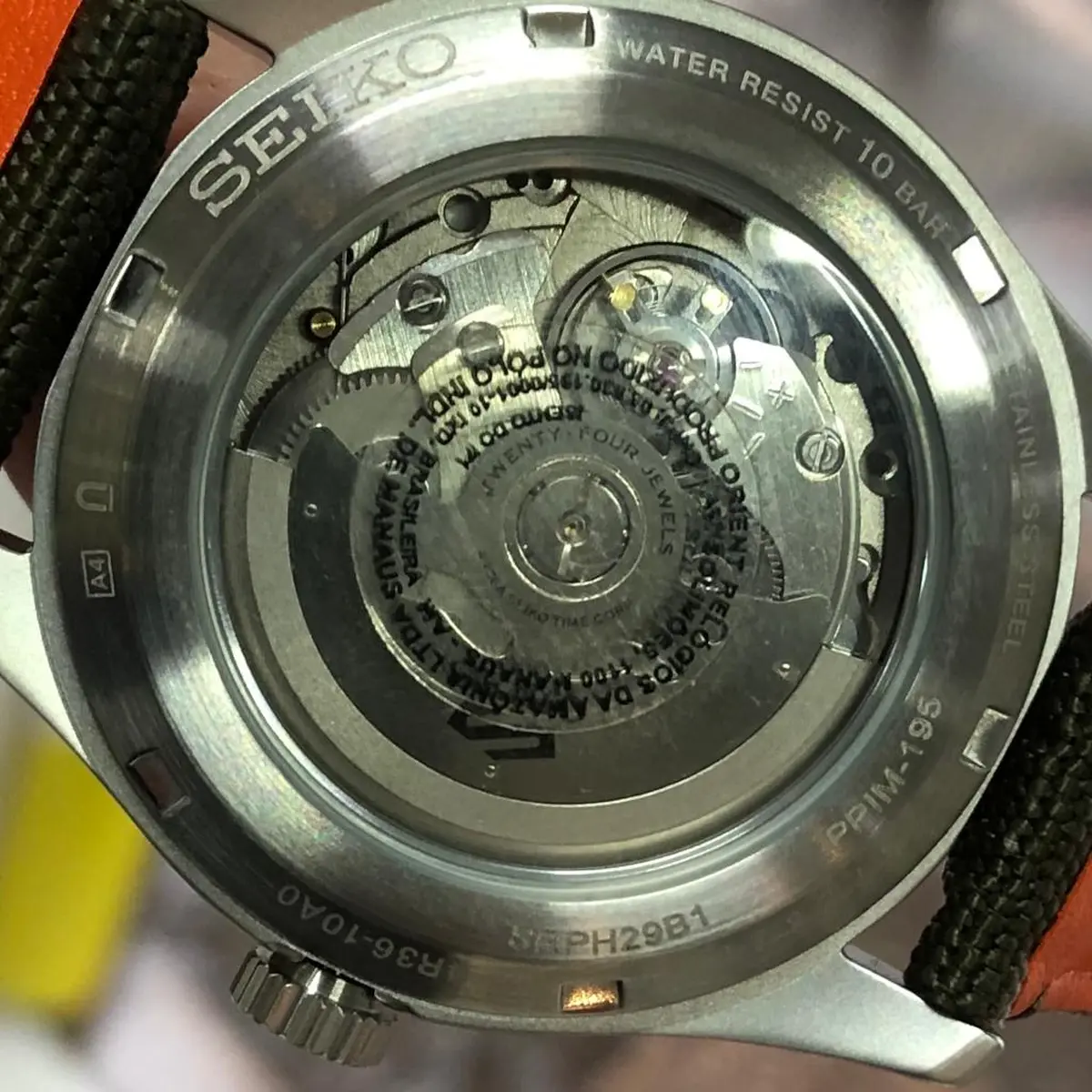 - Movimento: Automático, Calibre 4R36. Possui corda manual e função hacking (parada do segundeiro para ajuste exato da hora).