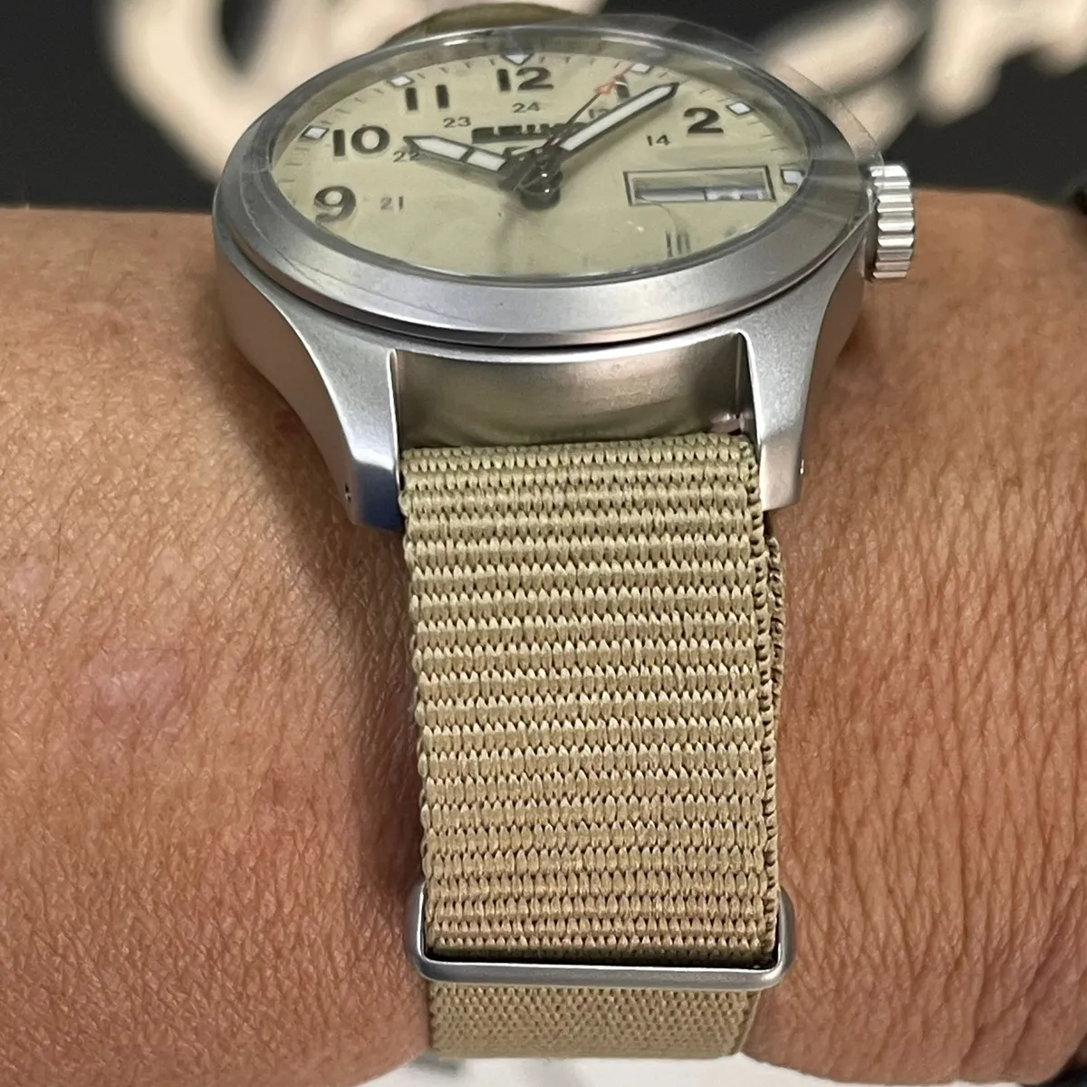Com apenas 36,4mm de diâmetro, o SRPJ83 oferece um conforto excepcional, desaparecendo no pulso até que você precise dele. O cristal Hardlex curvo adiciona um charme vintage e resistência a impactos, enquanto a resistência à água de 100 metros (10 bar) garante que o relógio suporte natação e atividades cotidianas sem preocupações. A pulseira de nylon bege estilo NATO é leve, lavável e extremamente resistente, completando o visual militar autêntico.