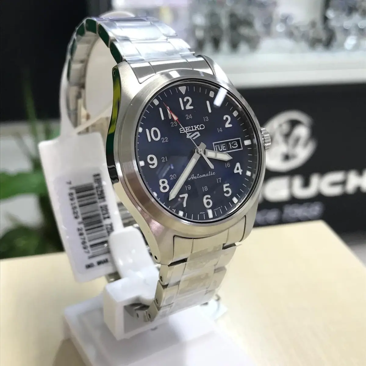 Seiko SRPG29 é um relógio automático militar com mostrador azul, caixa de 39mm em aço, calibre 4R36 e resistência de 100m, unindo robustez e estilo.