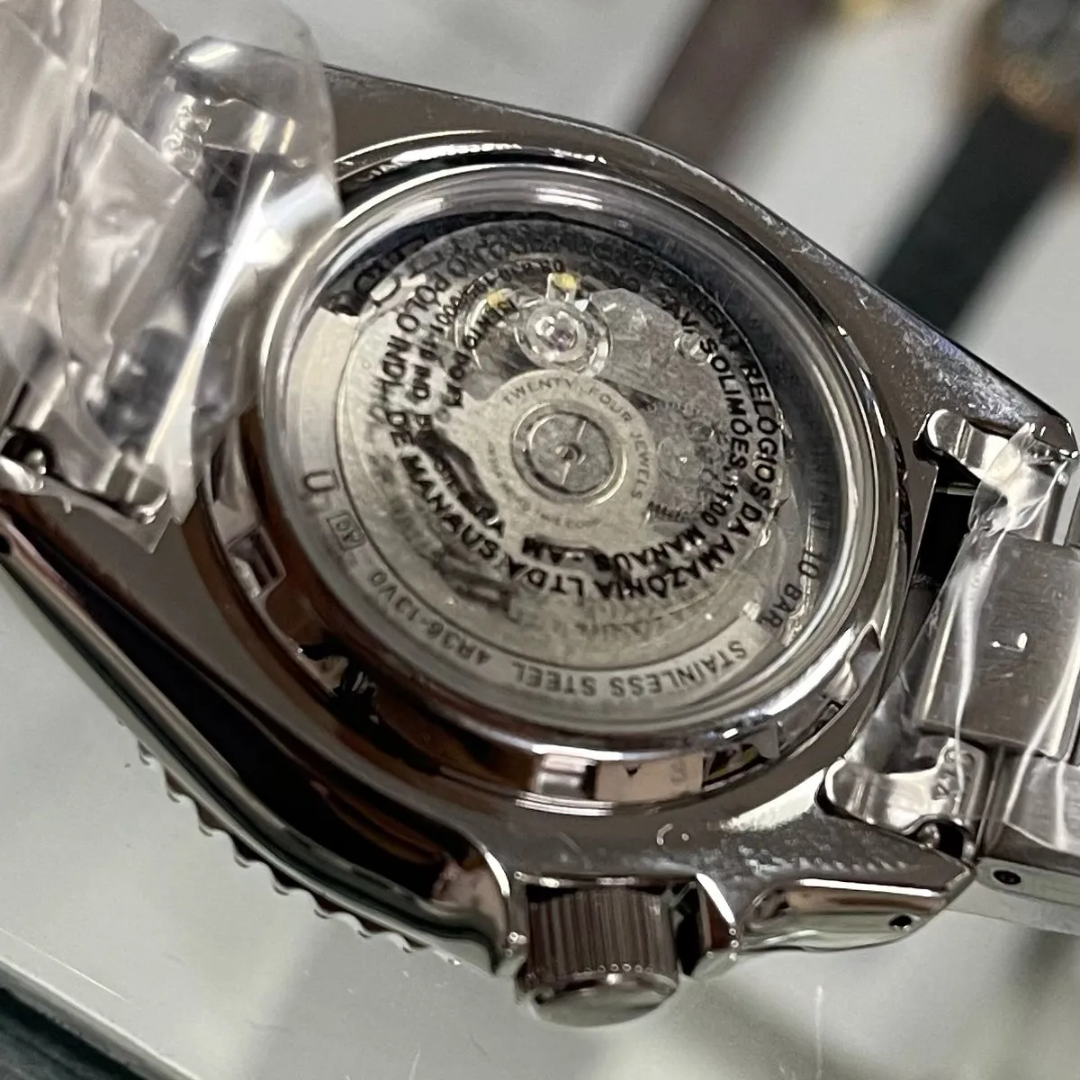 - Movimento: Automático, Calibre 4R36. Possui capacidade de corda manual e função de interrupção do segundeiro (hacking).