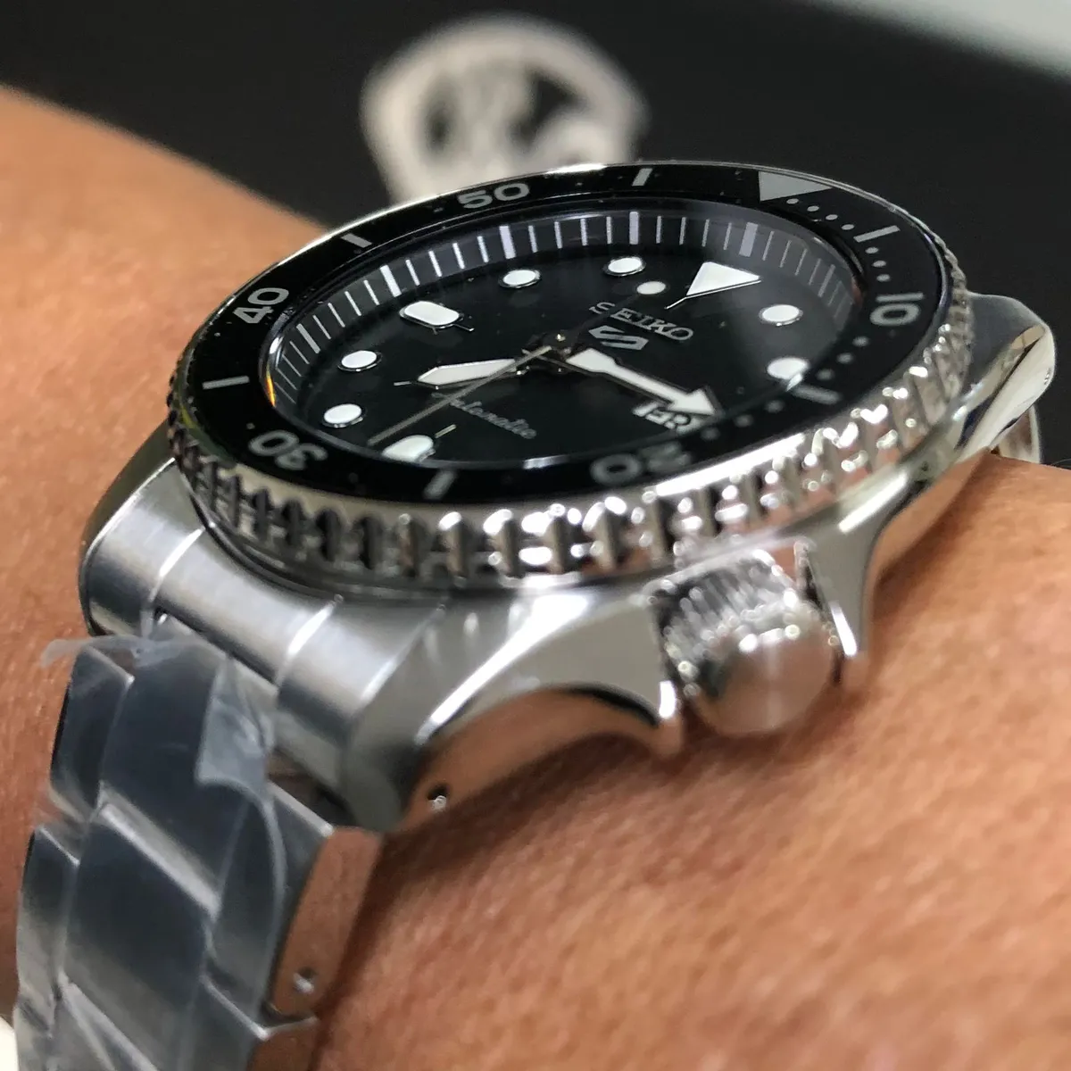 O mostrador é preto fosco, com ponteiros e índices aplicados generosamente revestidos com LumiBrite, garantindo uma luminescência intensa em ambientes escuros. O vidro é de cristal Hardlex, material proprietário da Seiko que oferece boa resistência a impactos.