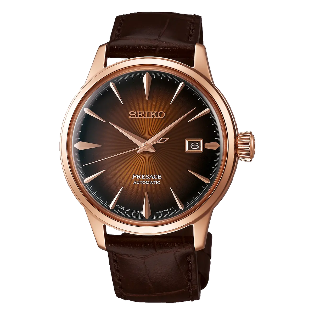 O Seiko Presage SRPB46J1 é um relógio automático elegante, conhecido como "Cocktail Time Manhattan", que se destaca por sua caixa rosé gold e um mostrador marrom em degradê com efeito sunburst.