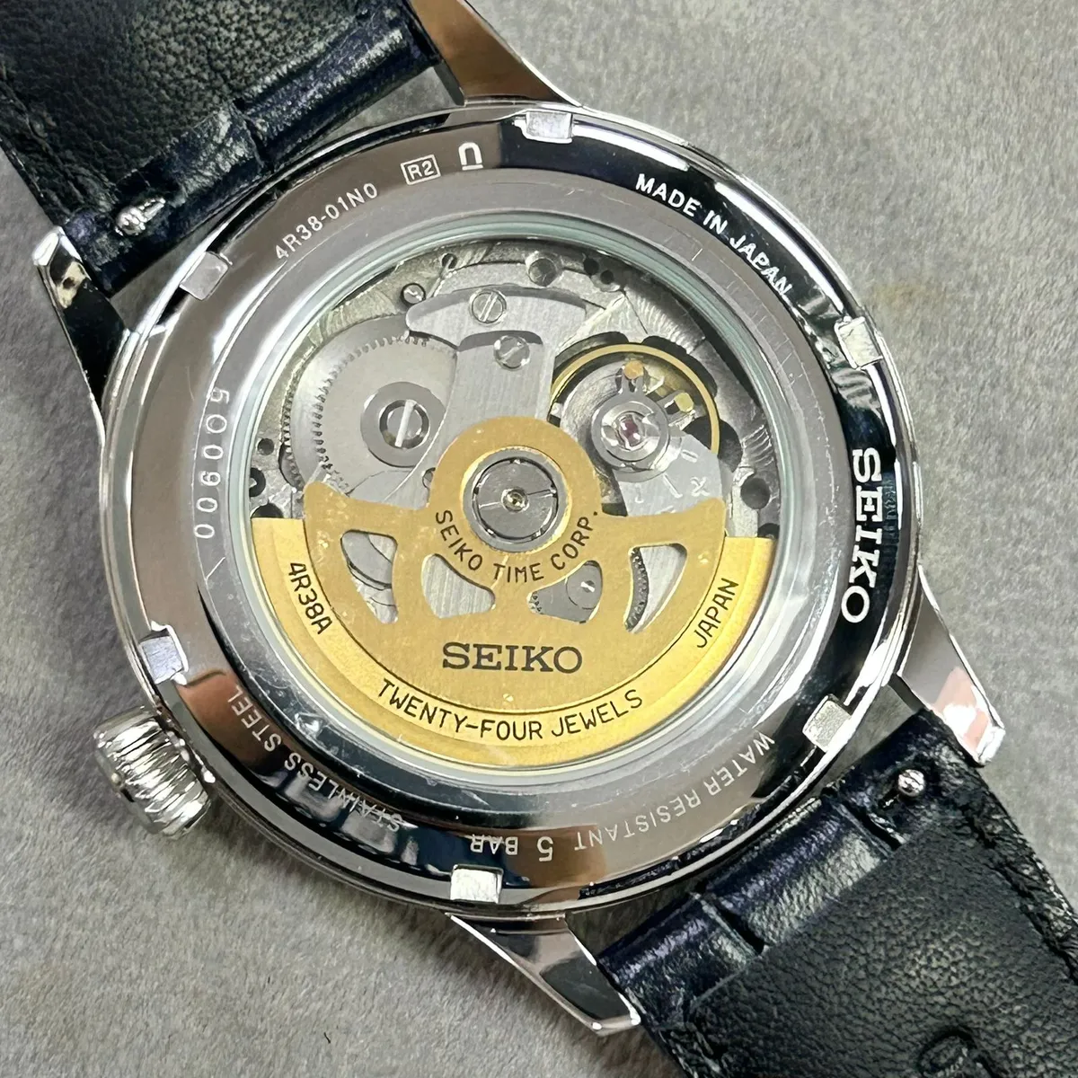 - Movimento: Automático, Calibre 4R38 (in-house da Seiko), com capacidade de corda manual e função de parada do segundo ponteiro ("hacking"). Possui 24 rubis.