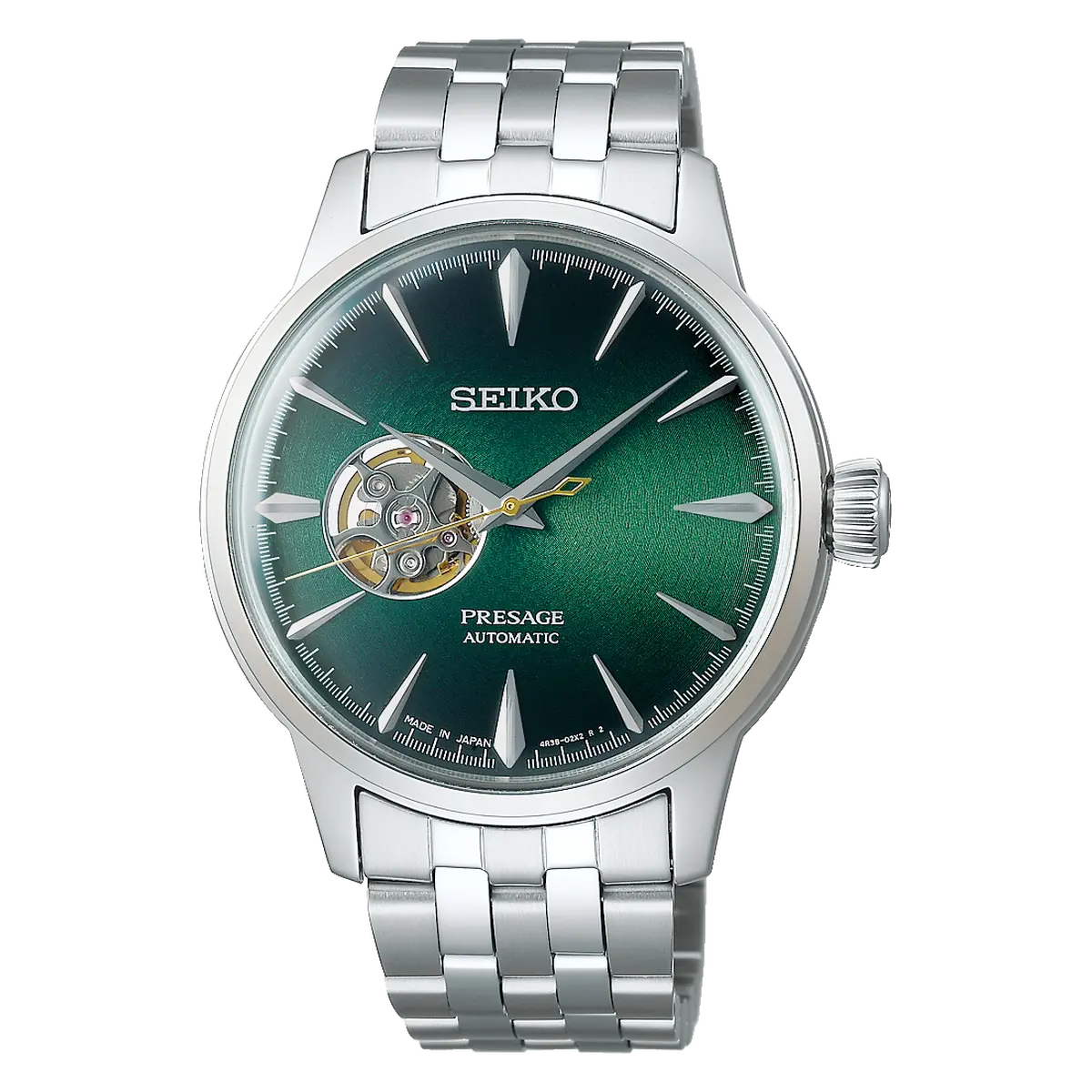 Seiko Presage SSA441J1 "Grasshopper" é um relógio automático elegante que se destaca pelo seu hipnotizante mostrador verde esmeralda em degradê e a abertura "open heart" que revela a beleza do movimento mecânico em funcionamento.