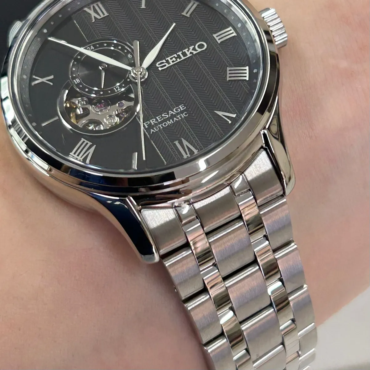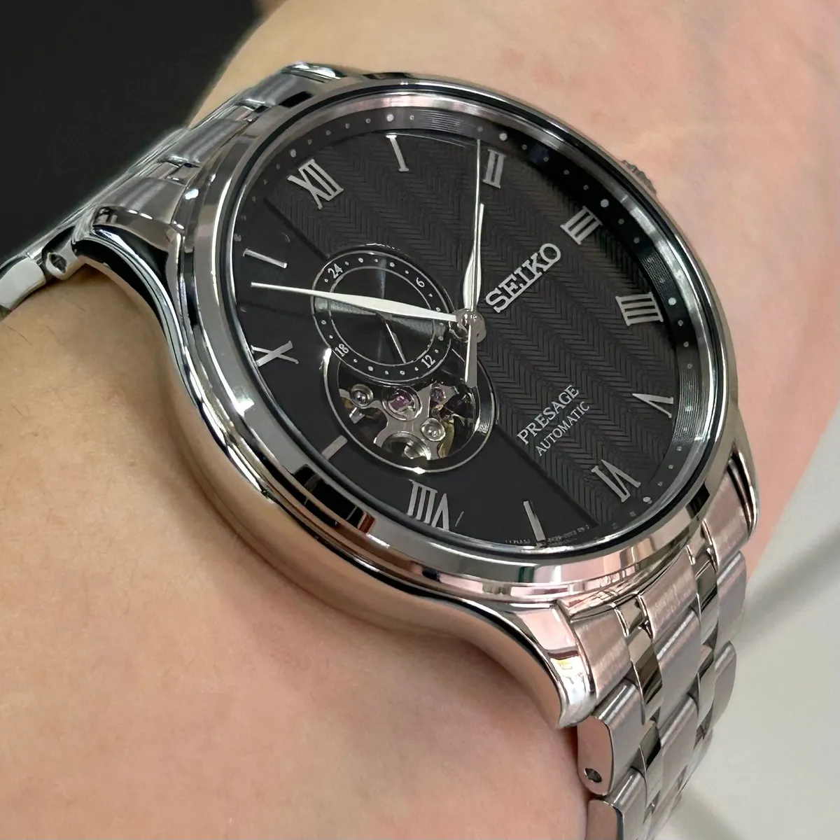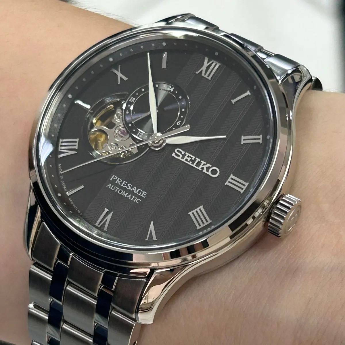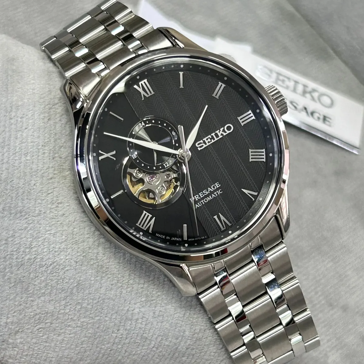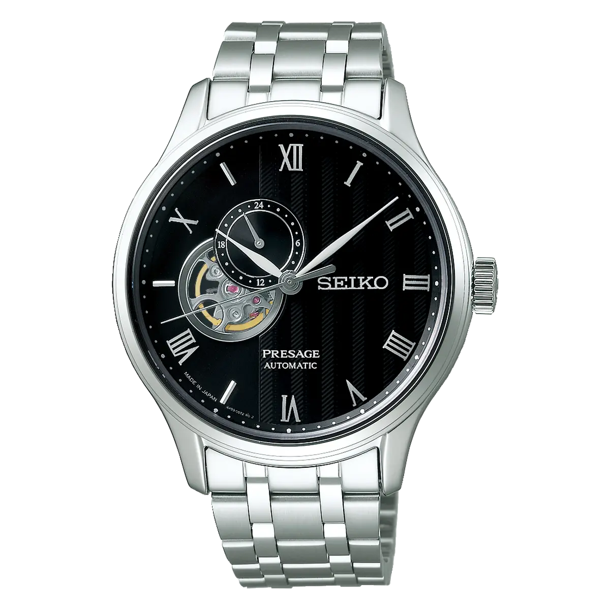 O Seiko Presage SSA377J1 é um relógio automático com vidro de safira e movimento calibre 4R39, que une a elegância do design "Open Heart" a um mostrador preto com textura de areia rastelada, capturando a essência minimalista dos jardins japoneses.