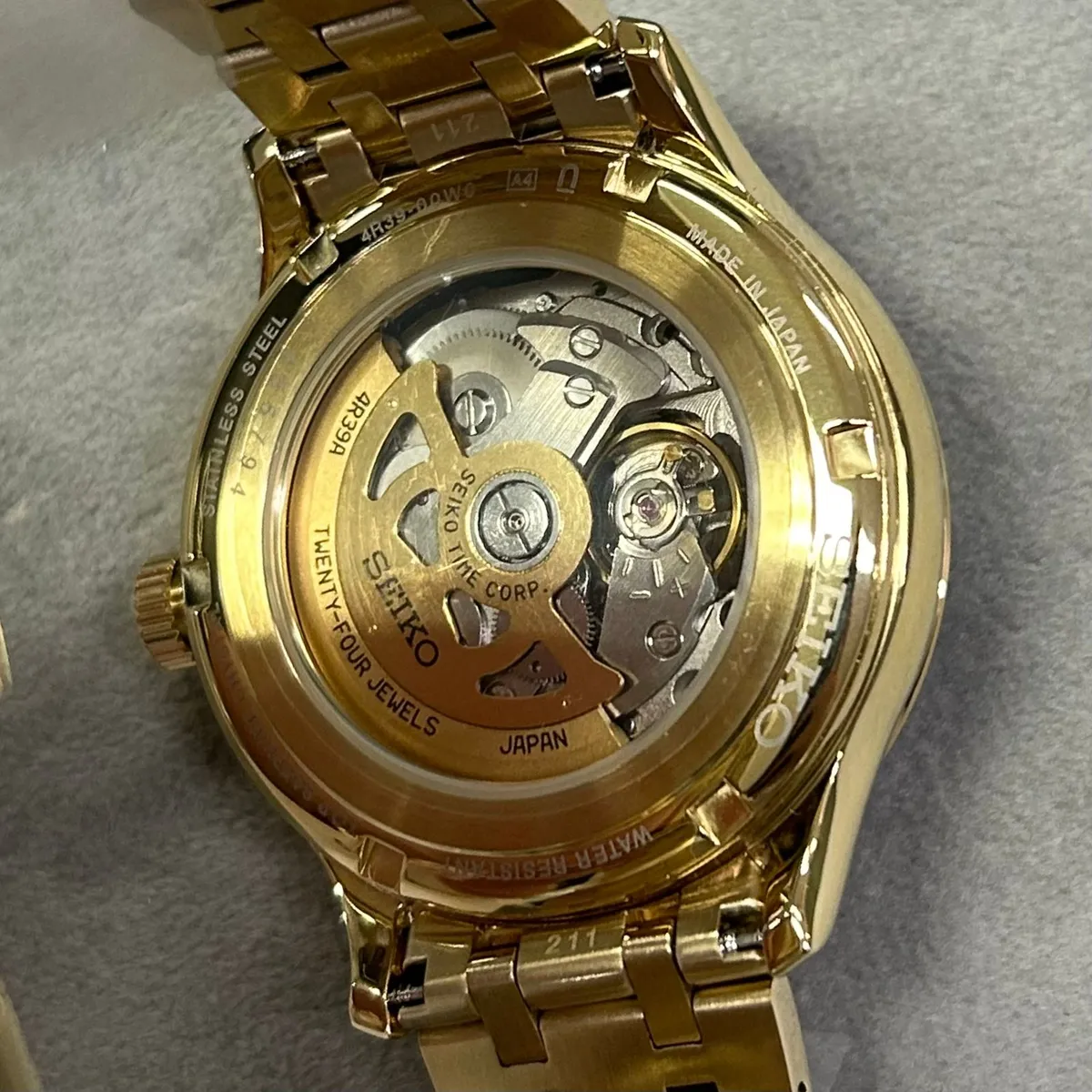 - Caixa e Pulseira: Fabricadas em aço inoxidável com revestimento dourado polido.