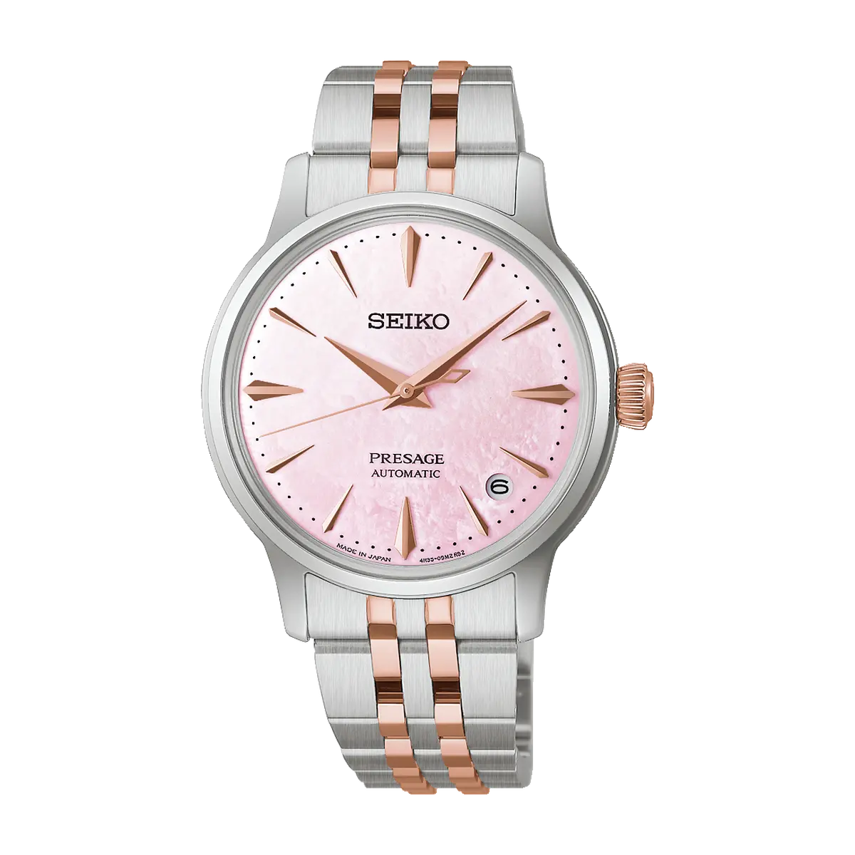 Seiko Presage SRPM06J1 Edição Limitada: mostrador madrepérola rosa, caixa 34mm e calibre automático 4R35. Exclusividade e sofisticação atemporal.