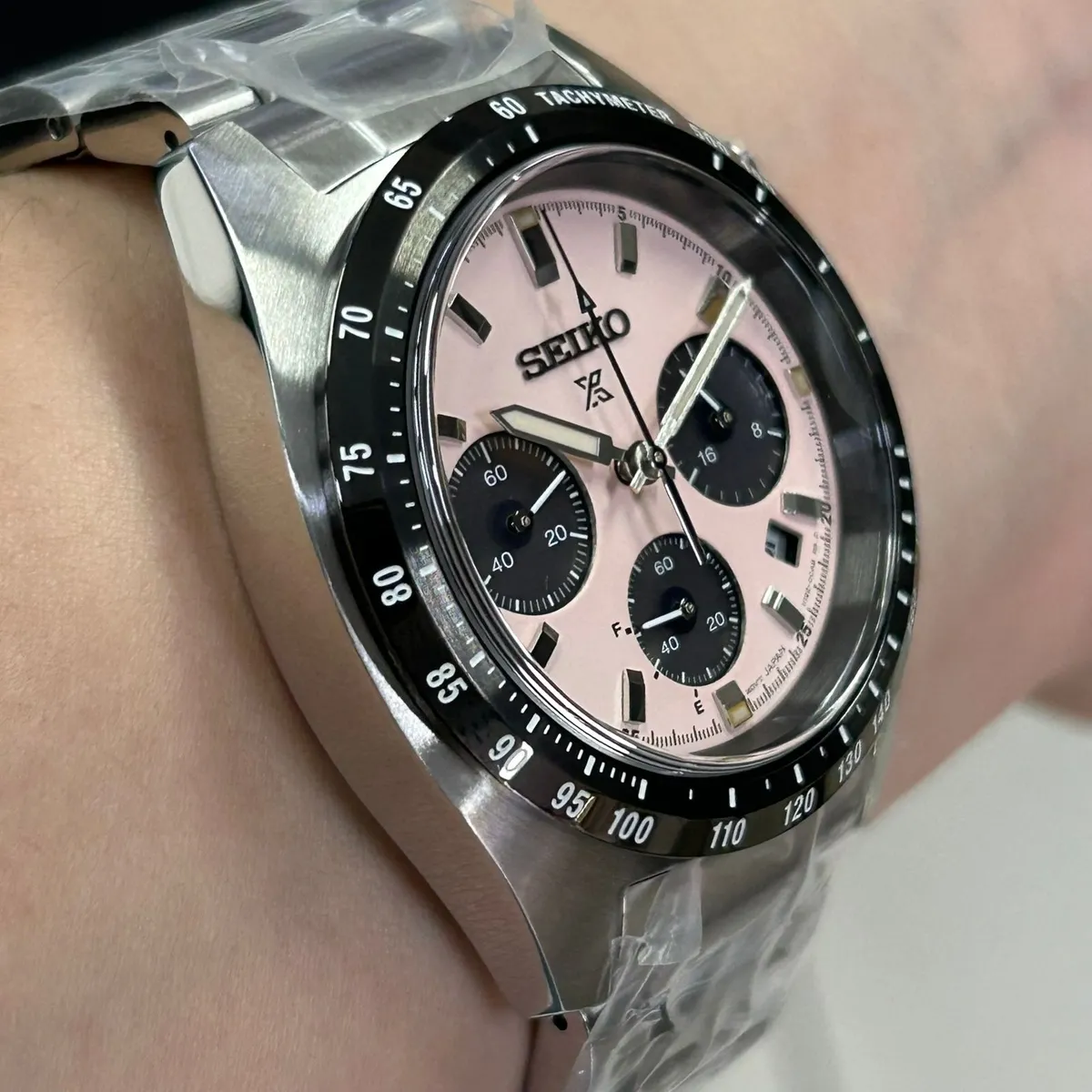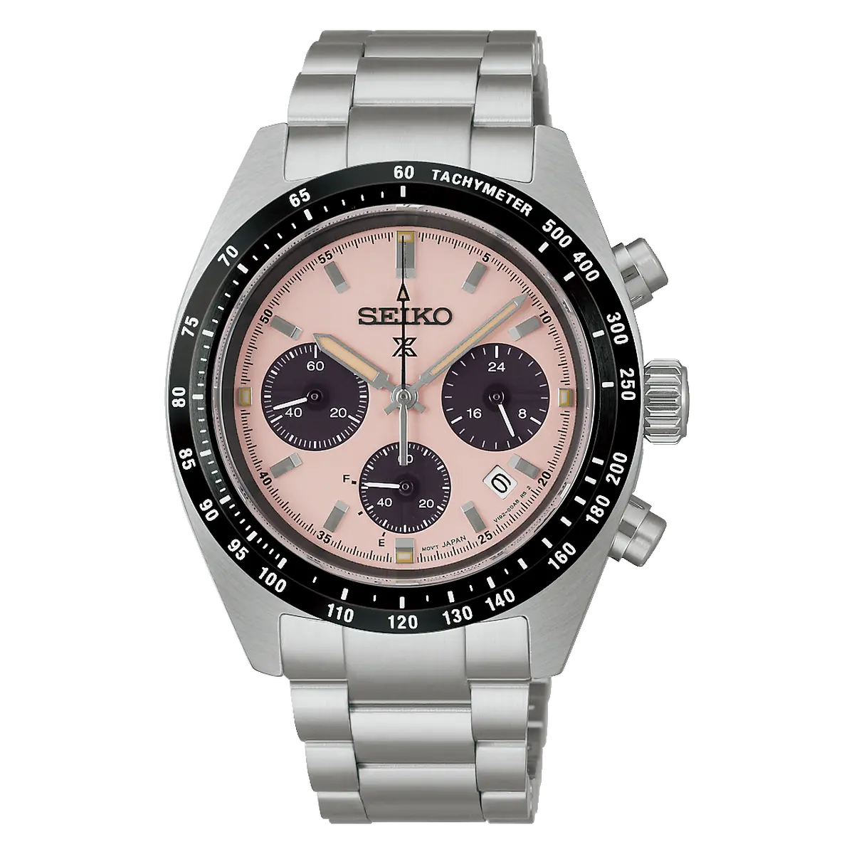 O Seiko Speedtimer SSC963 destaca-se imediatamente pelo seu mostrador em tom salmão/rosa pastel com acabamento jateado. Este visual, inspirado nas tendências vibrantes das décadas passadas, ganha um ar moderno com os três submostradores pretos, criando uma variação exótica do clássico design "Panda". O bezel de aço inoxidável com escala taquimétrica preta completa o visual esportivo, garantindo que o relógio seja o centro das atenções em qualquer ocasião.