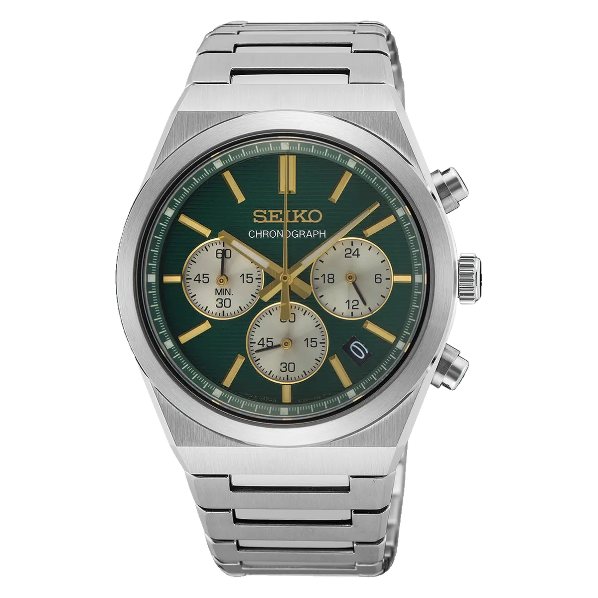 Seiko SSB461 é um cronógrafo de aço com cristal de safira, mostrador verde texturizado, detalhes dourados e calibre de quartzo preciso até 100m.